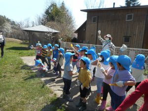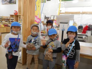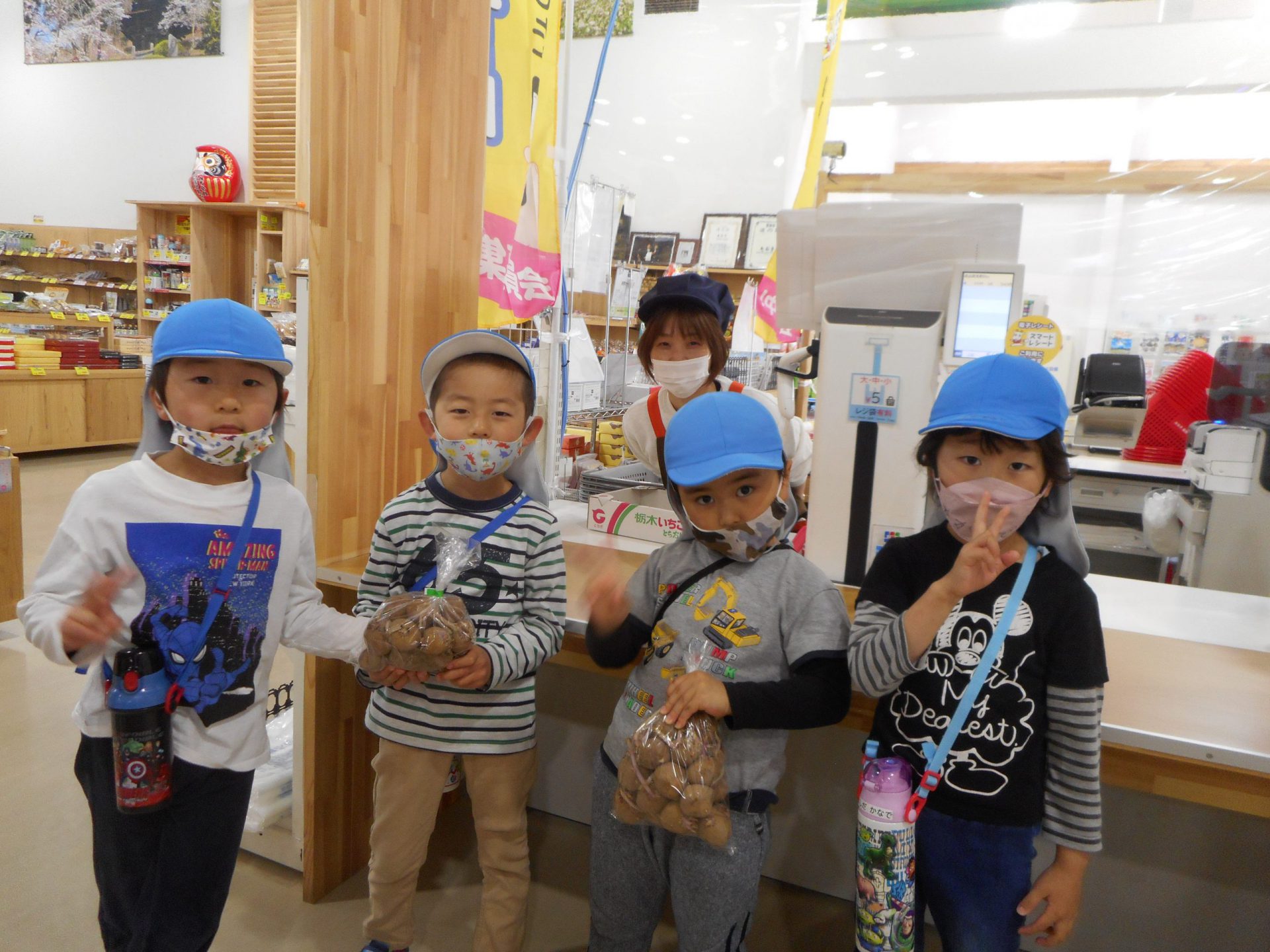 年長クラスになって最初のイベントは、じゃがいも植えです。まずは種芋を手に入れる事。青木村の道の駅までレッツゴー!コロナ禍の為、入店は代表のお友だち4名でしたが、無事みんなの種芋をゲットです!