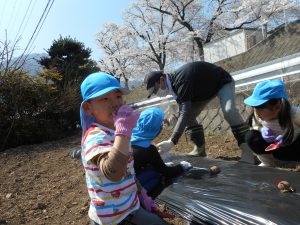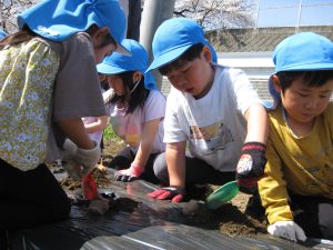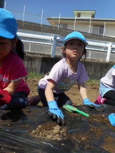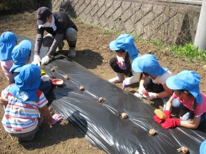 「この芽を取ったらだめだよ。それがじゃがいもになるんだよ」「植える時は芽を上にするんだって」等といろいろな知識が出てきてびっくりでした。お家でお手伝いをしたり教えてもらった事を他のお友だちにも伝えてくれます。