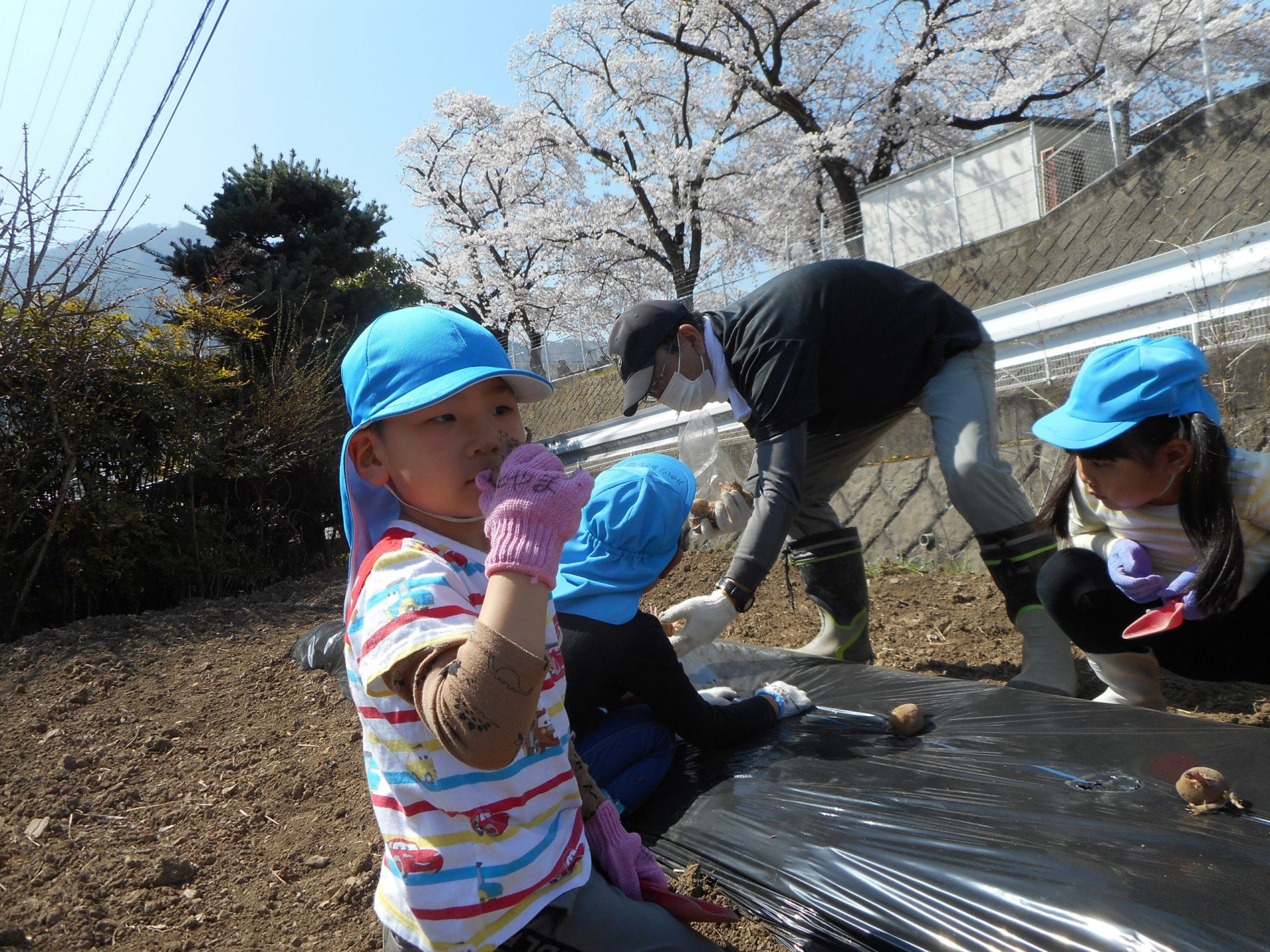 種芋を手にすると、芽が出ていることにすぐ気付き、「芽が出ているお芋は食べられないよ」という子がいました。
