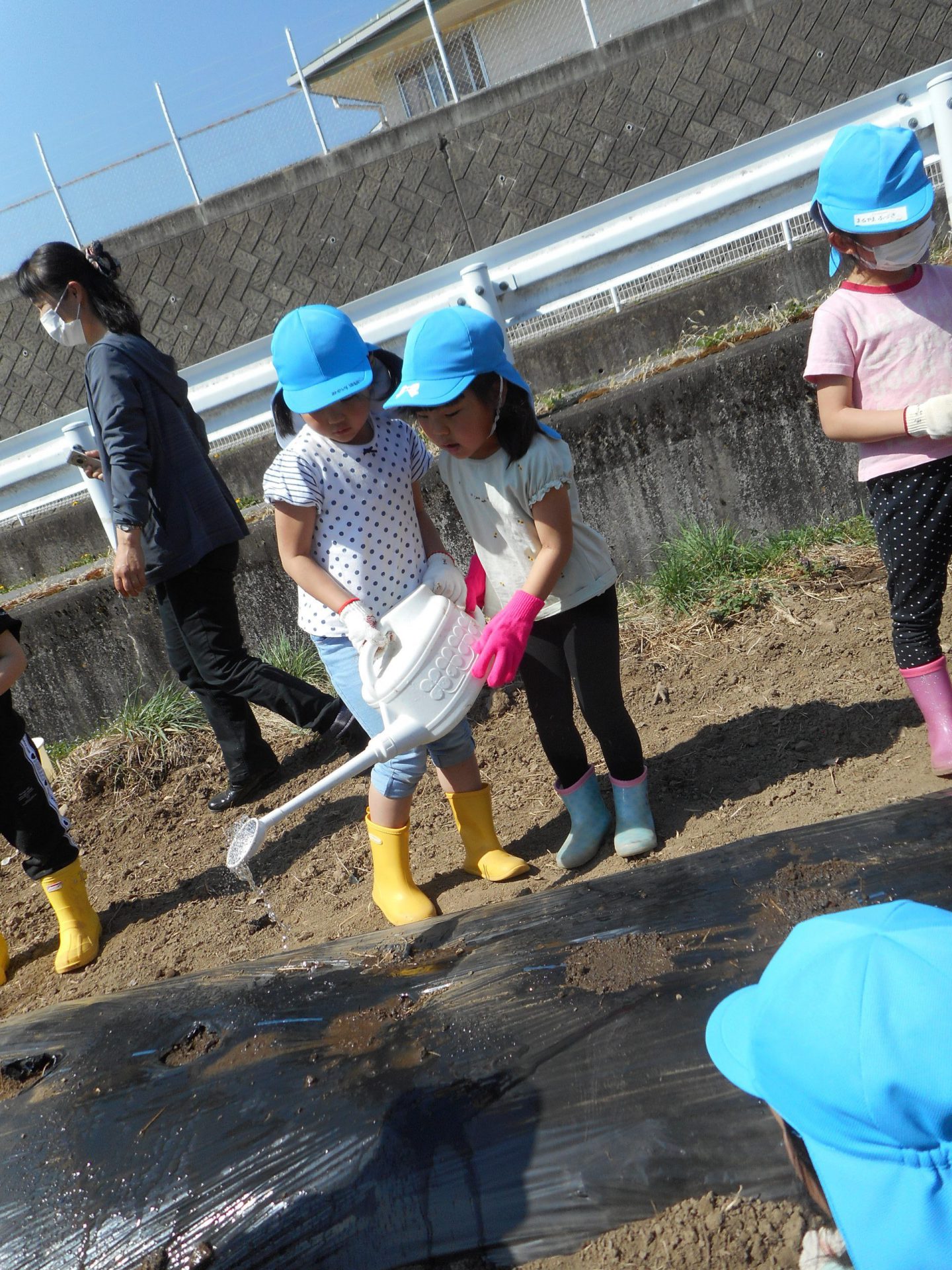 最後にお水をかけ、おまじないをしました。「大きくなあれ!いっぱい穫れますように!」