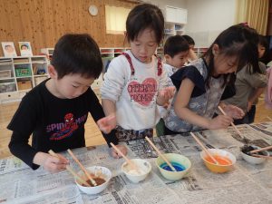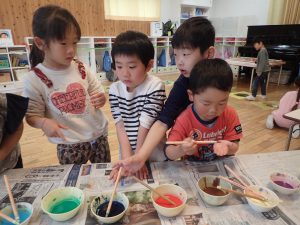 絵の具で色塗り! 赤・青・黒・茶・オレンジ・・・たくさんの色を用意しました