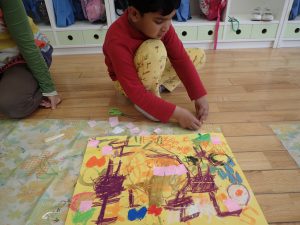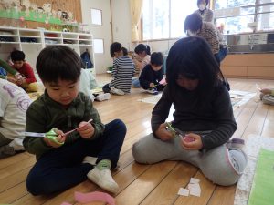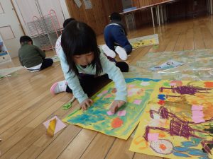 今まで取り組んできた制作でのアイディアも活かしながら、自分たちなりにイメージを広げて取り組む姿は、さすが年長児だなと感じました。