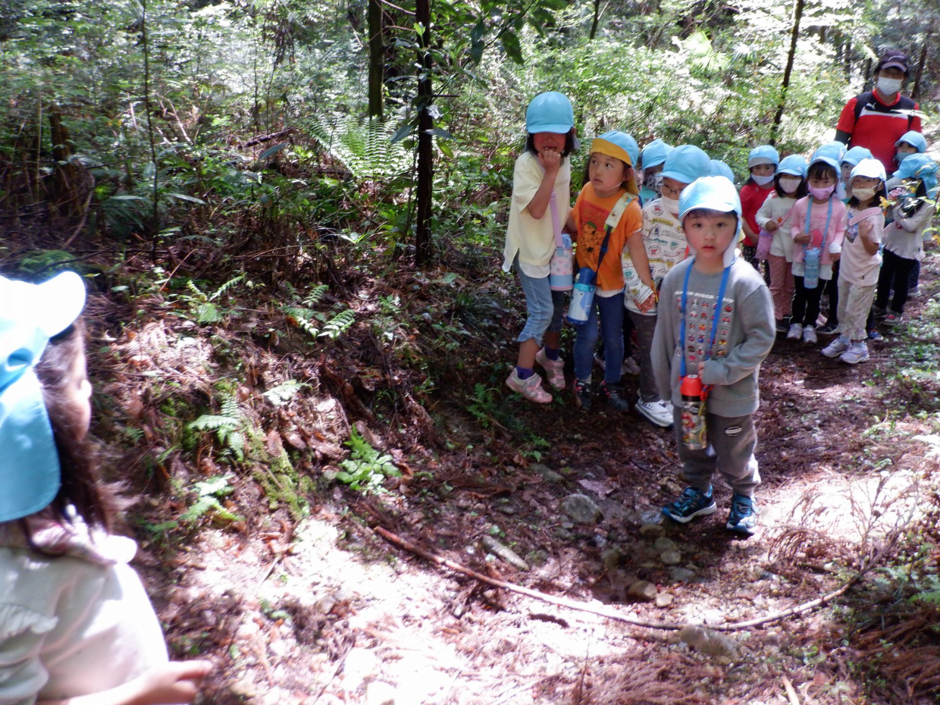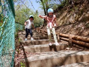 階段がたくさんの山道。行きは両足ジャンプで元気に、段数を大きな声で数えながら降りていく子がいっぱいいます。
