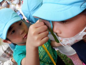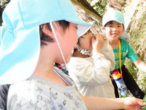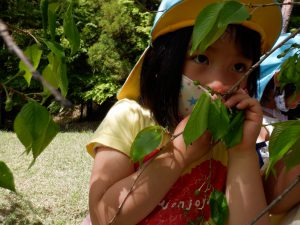 ・たくさんの自然の中で、どんどん子どもたちからの発見が増えていき、自ら周りの草花や木に注目したり、触ったり匂いを嗅ぎにいったりする姿が多く見られた。実際に自分の五感を使って感じた経験だからこそ、子どもたちが自然と「なんでだろう」と考えようとする姿につながったのではないか。