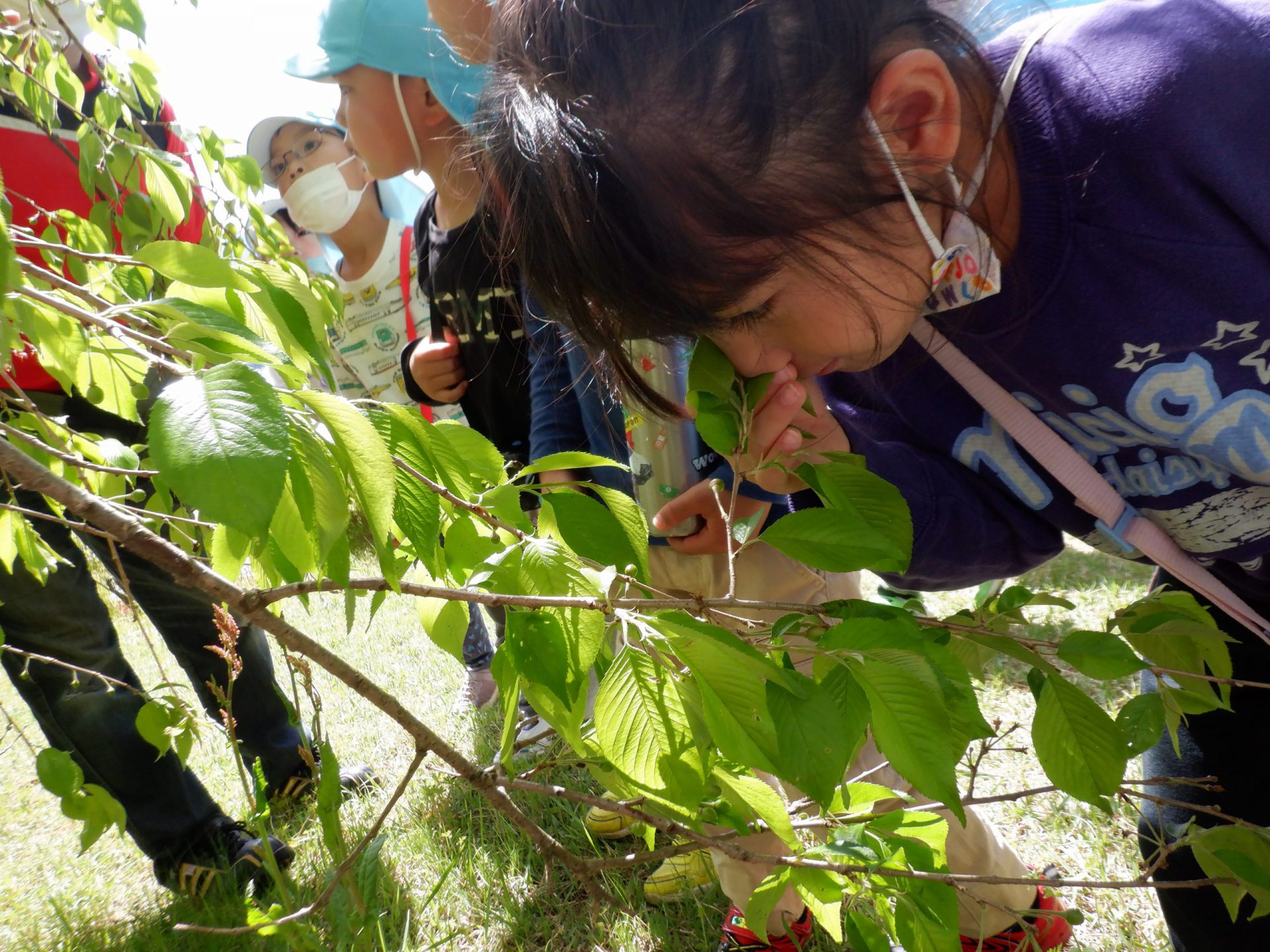 次々に桜の木の葉や実の匂いを嗅ぎに行く子どもたち。