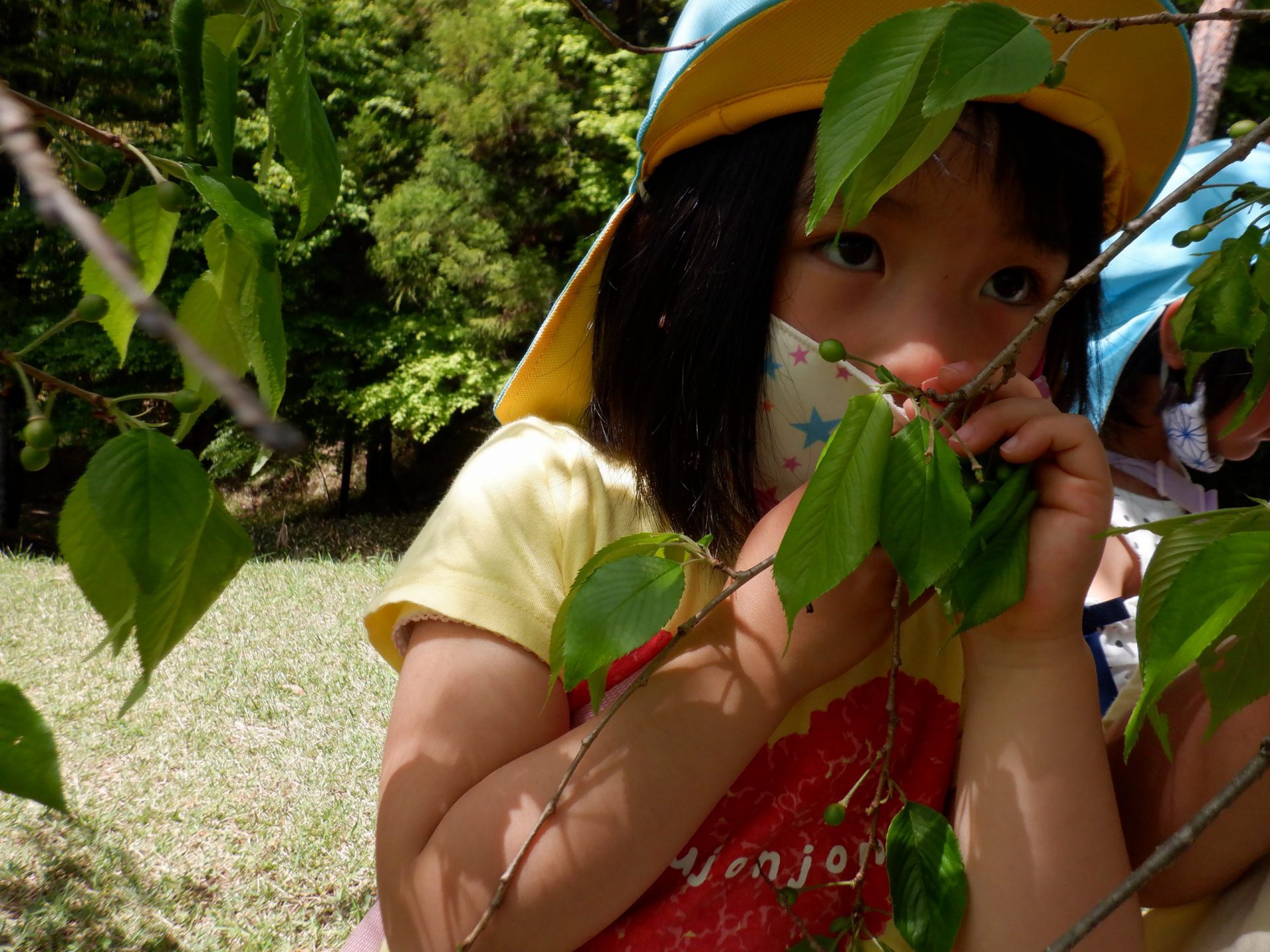・桜の木を近くで見ながら、「なんか実が付いてる!!」「これ何の実?匂いするかなあ」「匂い嗅ぐとこの実何になるか分かるかもしれん!」