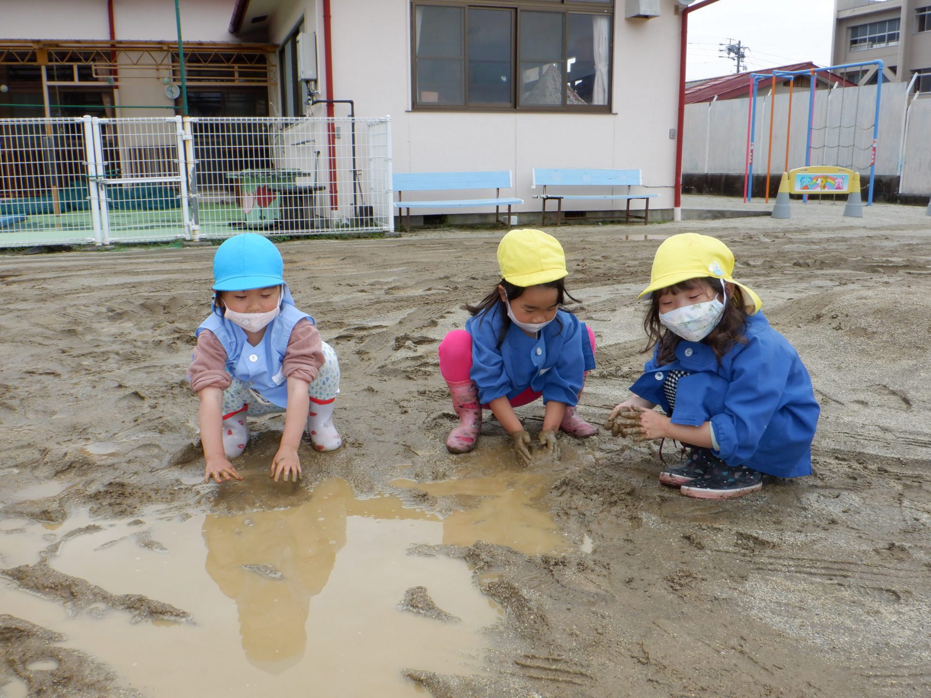 水たまりでは泥んこ遊びが始まった。