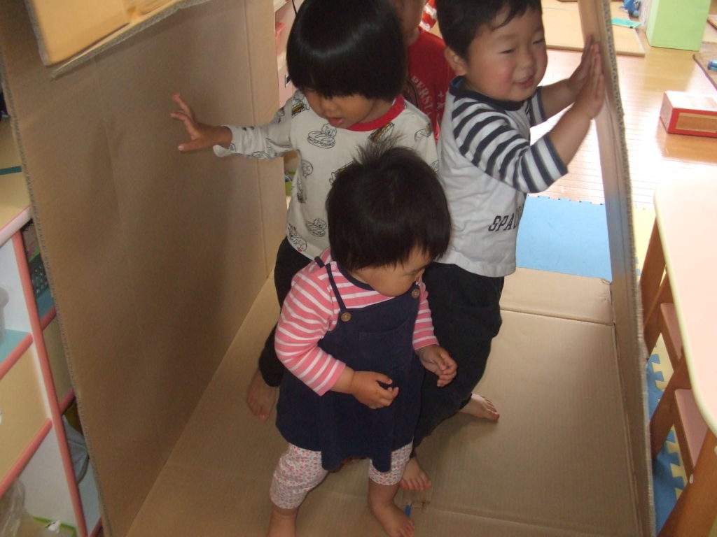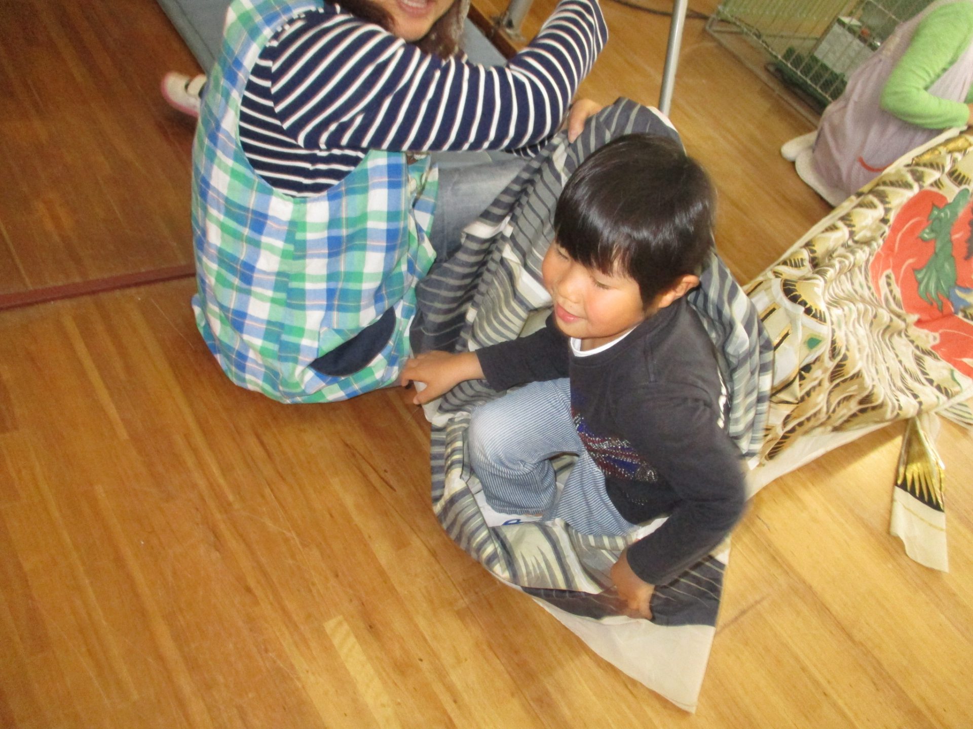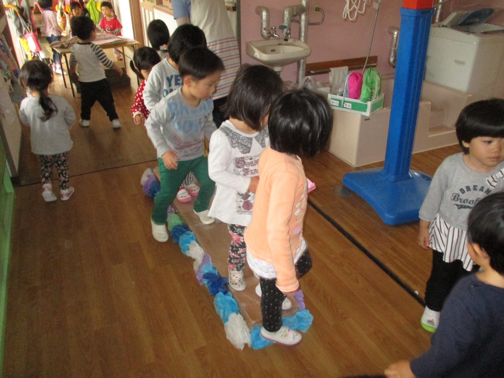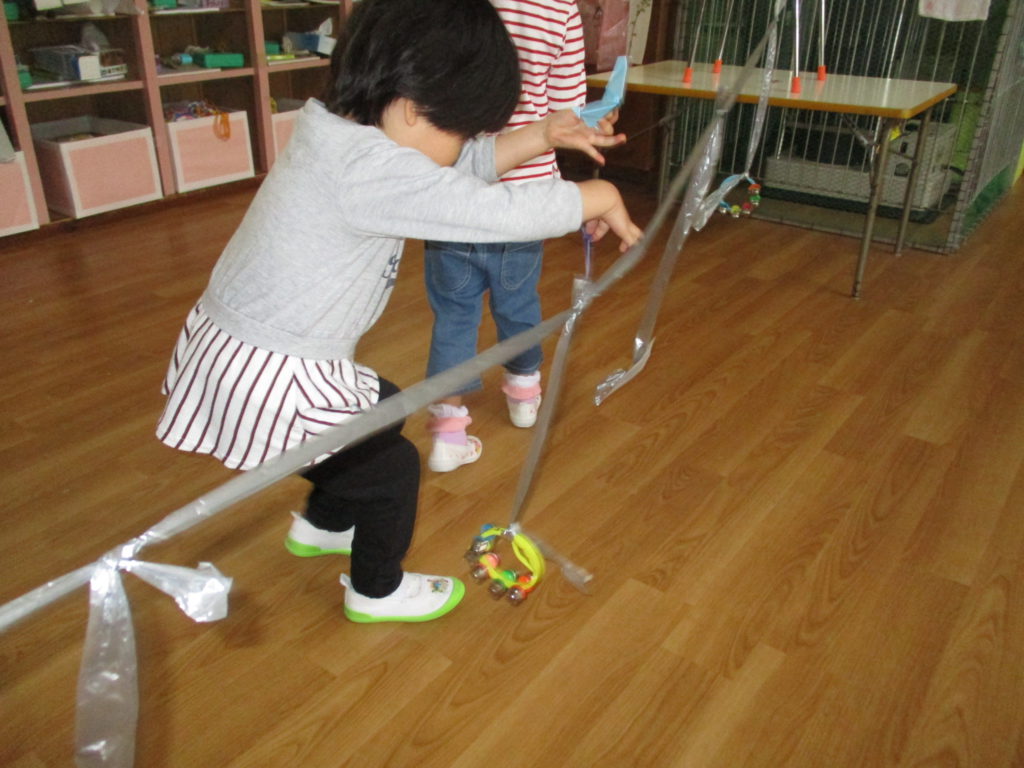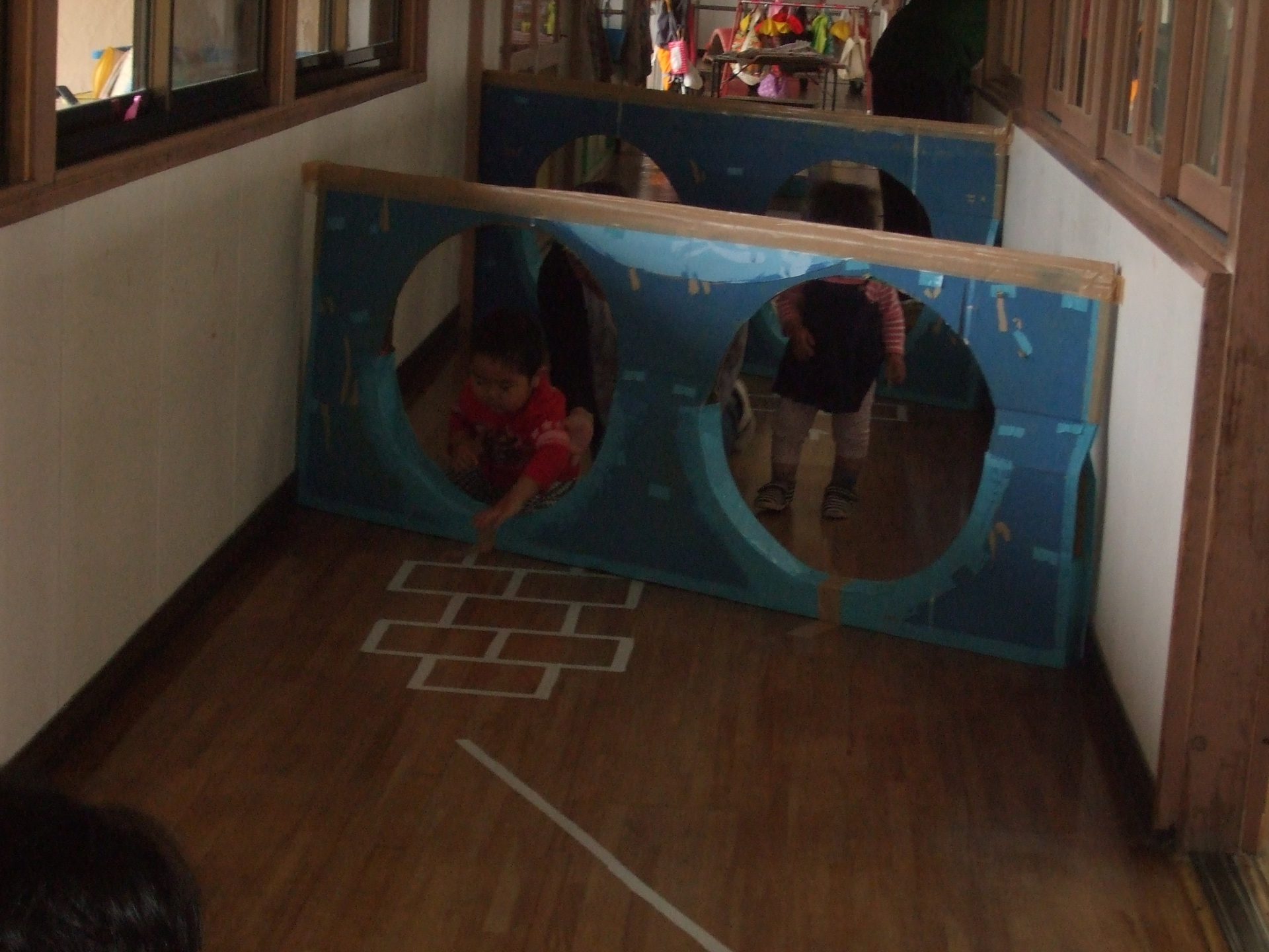 「こわい!」「最後までいけるかな?」と心配していたお友達も楽しそうに通るお友達の姿を見て「やってみる!」と挑戦し、くぐり抜けると「やったー!できた!」「簡単だったよ!」とドヤ顔を披露してくれました。