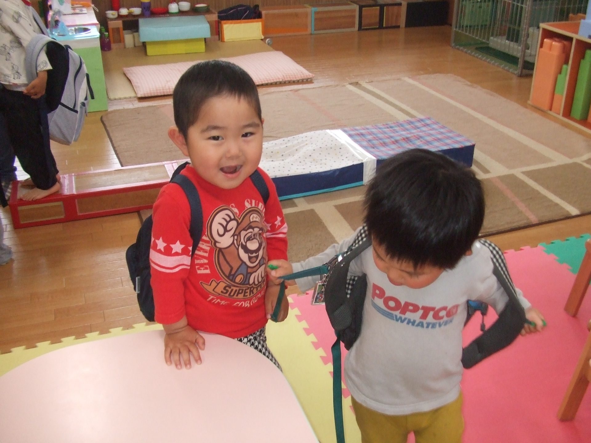お部屋に帰ってからはカバンを背負って「さんぽ」の曲に合わせて歩き、遠足気分を味わいました。たくさん歩いて目的地に到着!