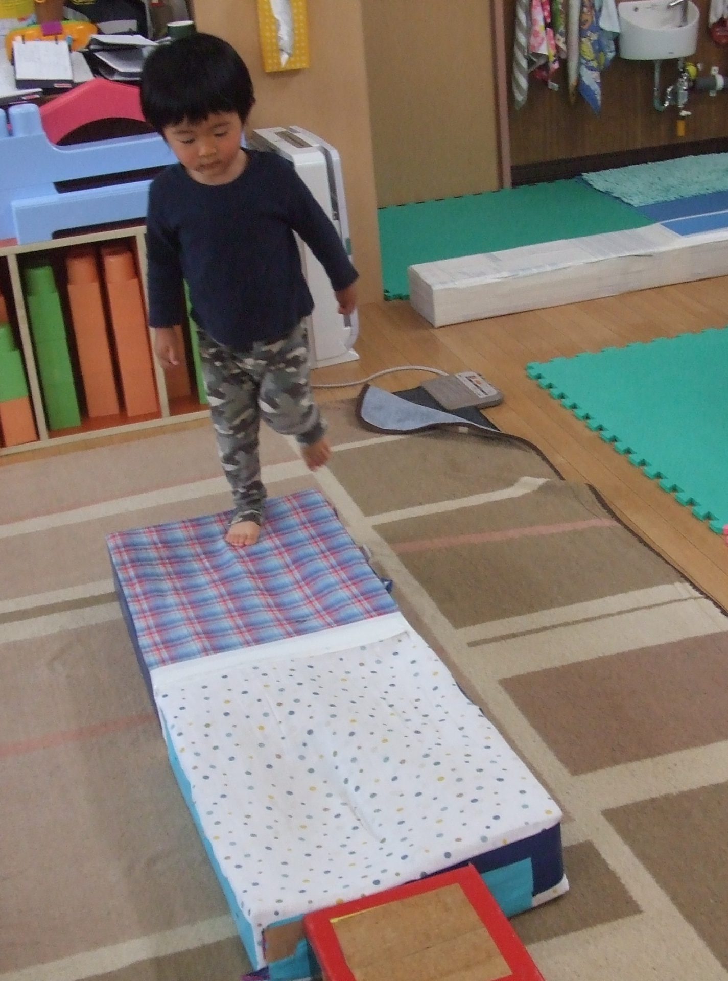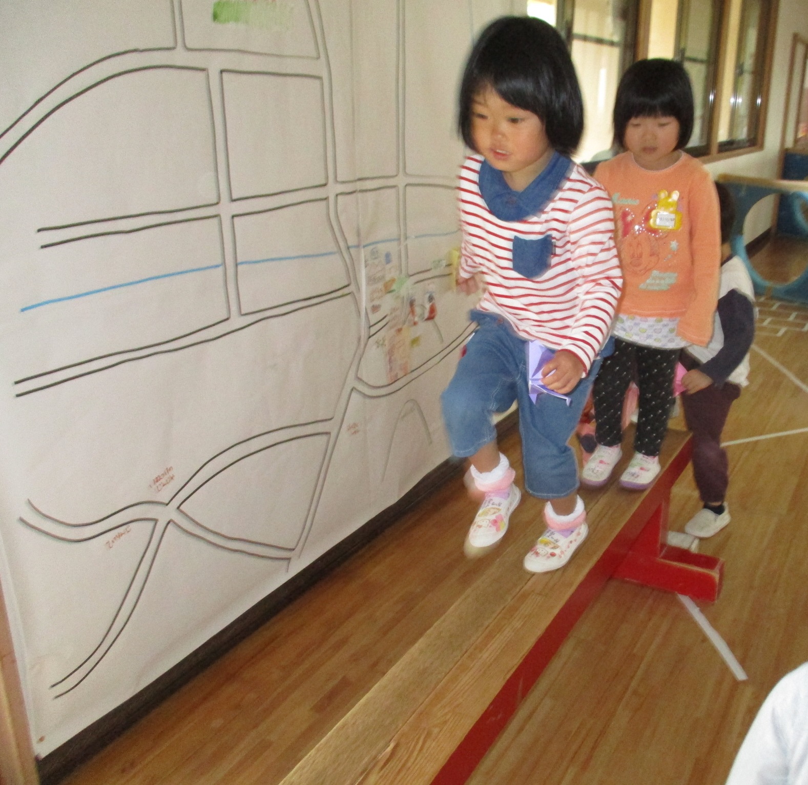 平均台も「一本橋みたいだね!」と農道で遊んでいるように上手に渡っていて、戸外での活動で自信がついていた子ども達は怖がることなくどんどん進む姿が見られました。