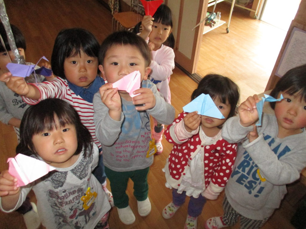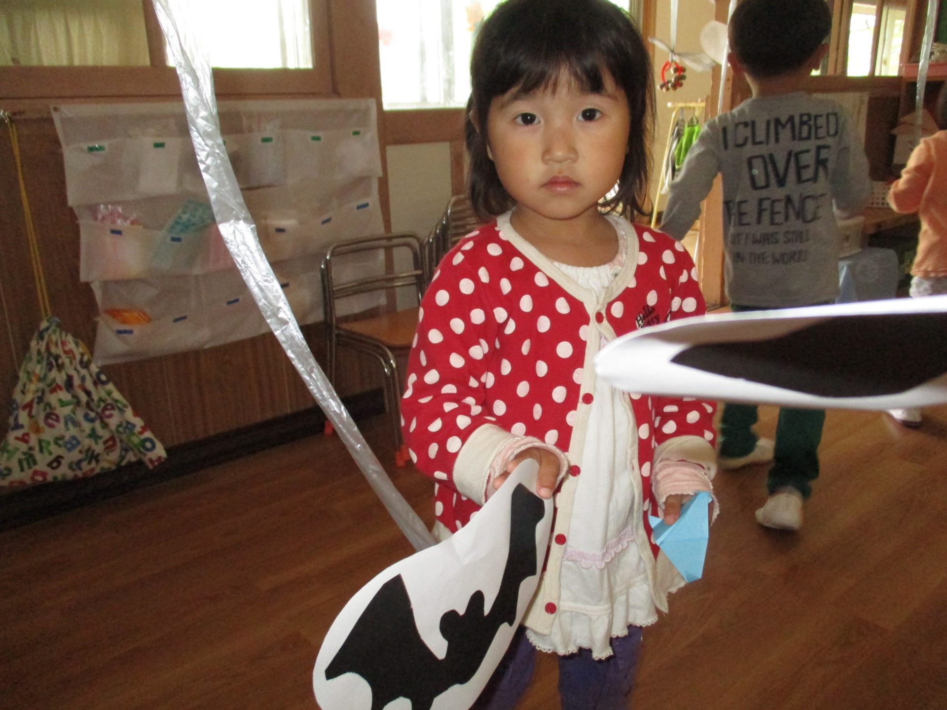 子ども達が園庭でちょうちょを捕まえて遊んでいる姿から、今回の活動を考えました。4、5歳児のクラスでは活動が終わった後、ちょうちょの作り方を保育士に聞いて、捕まえたちょうちょのお友達を作ったり、赤ちゃんちょうちょを作って親子にしたり、「ご飯をあげたい!」という思いからちょうちょにストロー状の口を作ってお花の蜜を吸わせてあげたりなど活動が広がり、日頃の遊びとの繋がりが見られました。行事的な活動が単発のイベントにならないように、今後も日々の子どもの様子から活動を考えていきたいなと思いました。