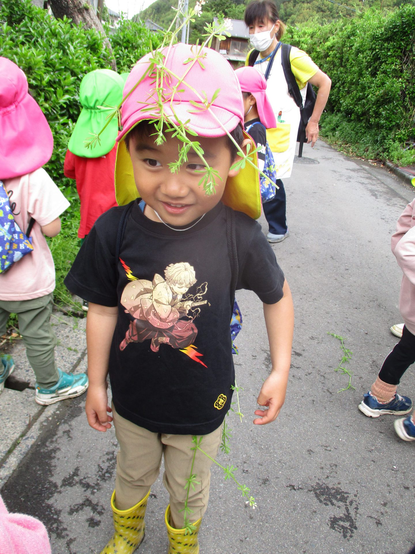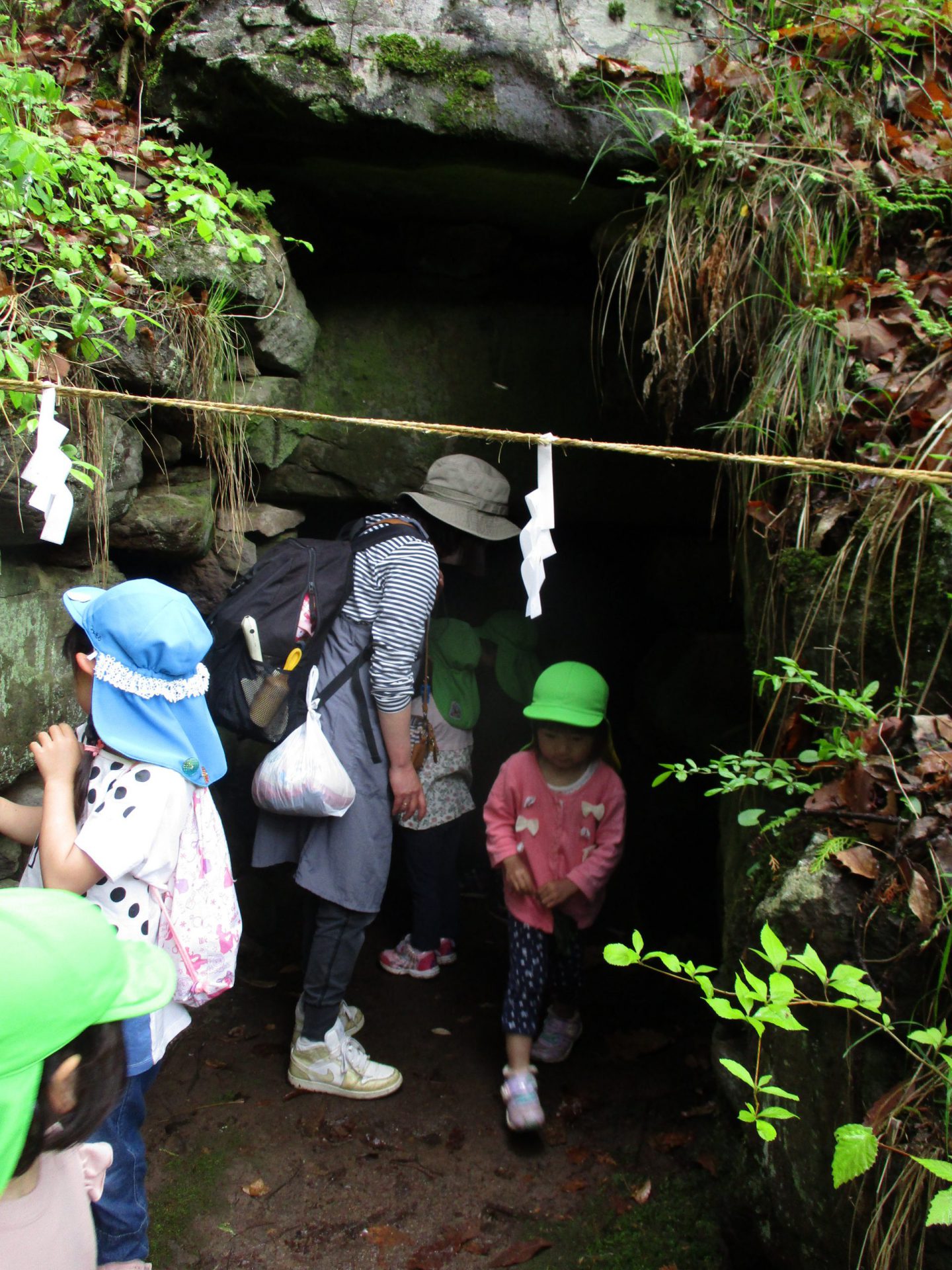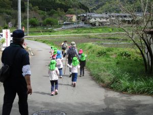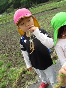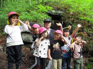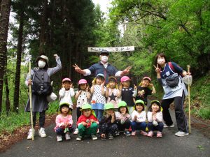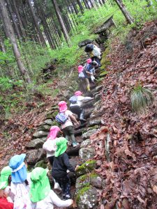 長いコースも歩き慣れている4,5歳児と一緒に行くことで、3歳児も無理なく楽しんで岩戸神社まで行くことができた。次々と興味をそそられることがあるということが自然と子供たちの足を軽やかにしたように感じる。異年齢で関わる中で一人一人の育ちを育み、積み重ねていきたい。