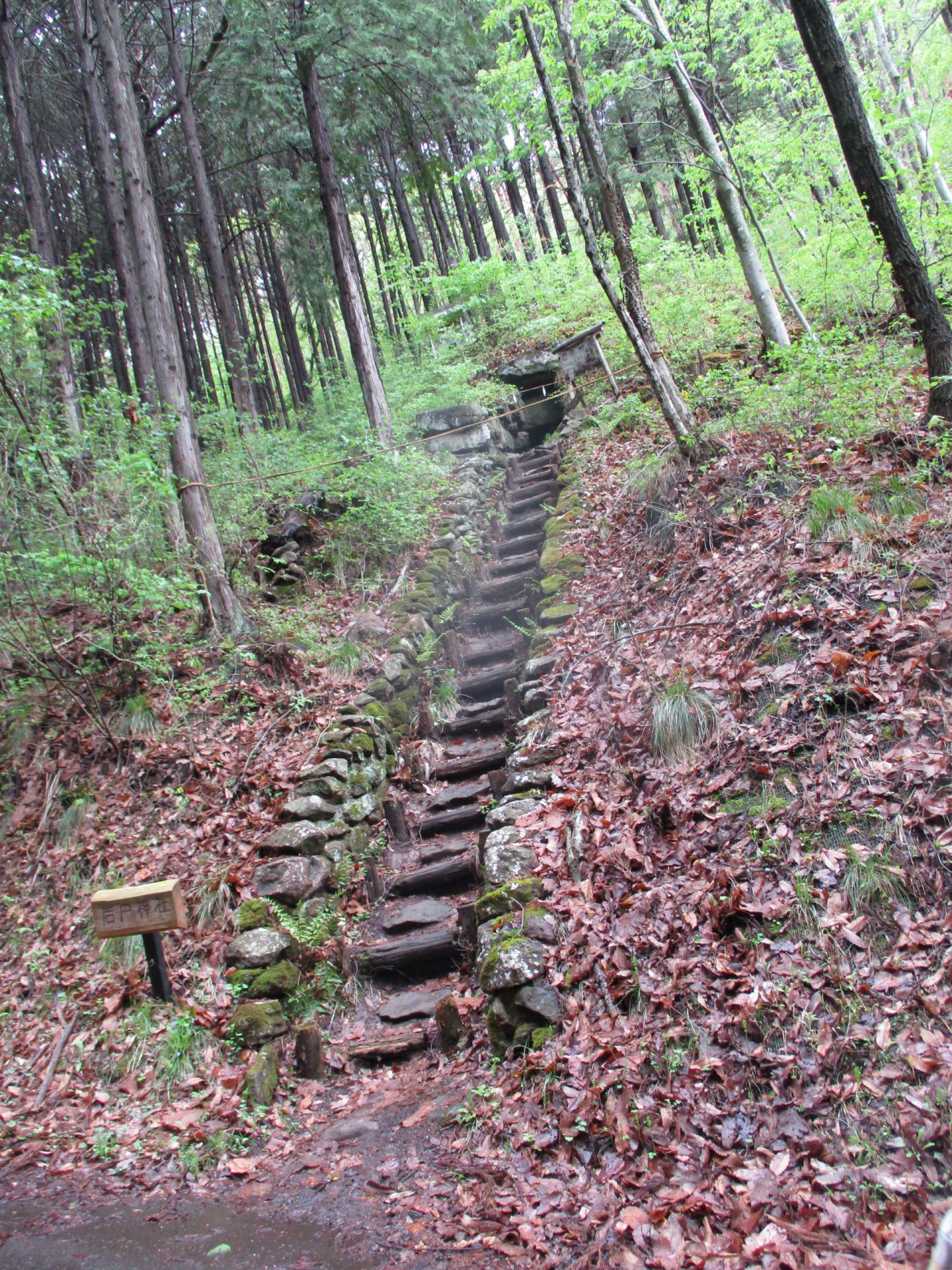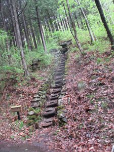 雨上がりで滑りやすい階段は手も使って慎重に…