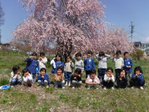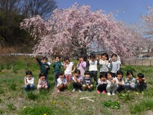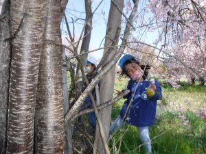 ・「ここは、僕のお家だよ」と枝垂桜の枝の下をおうちに見立てて遊ぶ子もいました。「先生どうぞ~」と優しく迎えてくれました。
