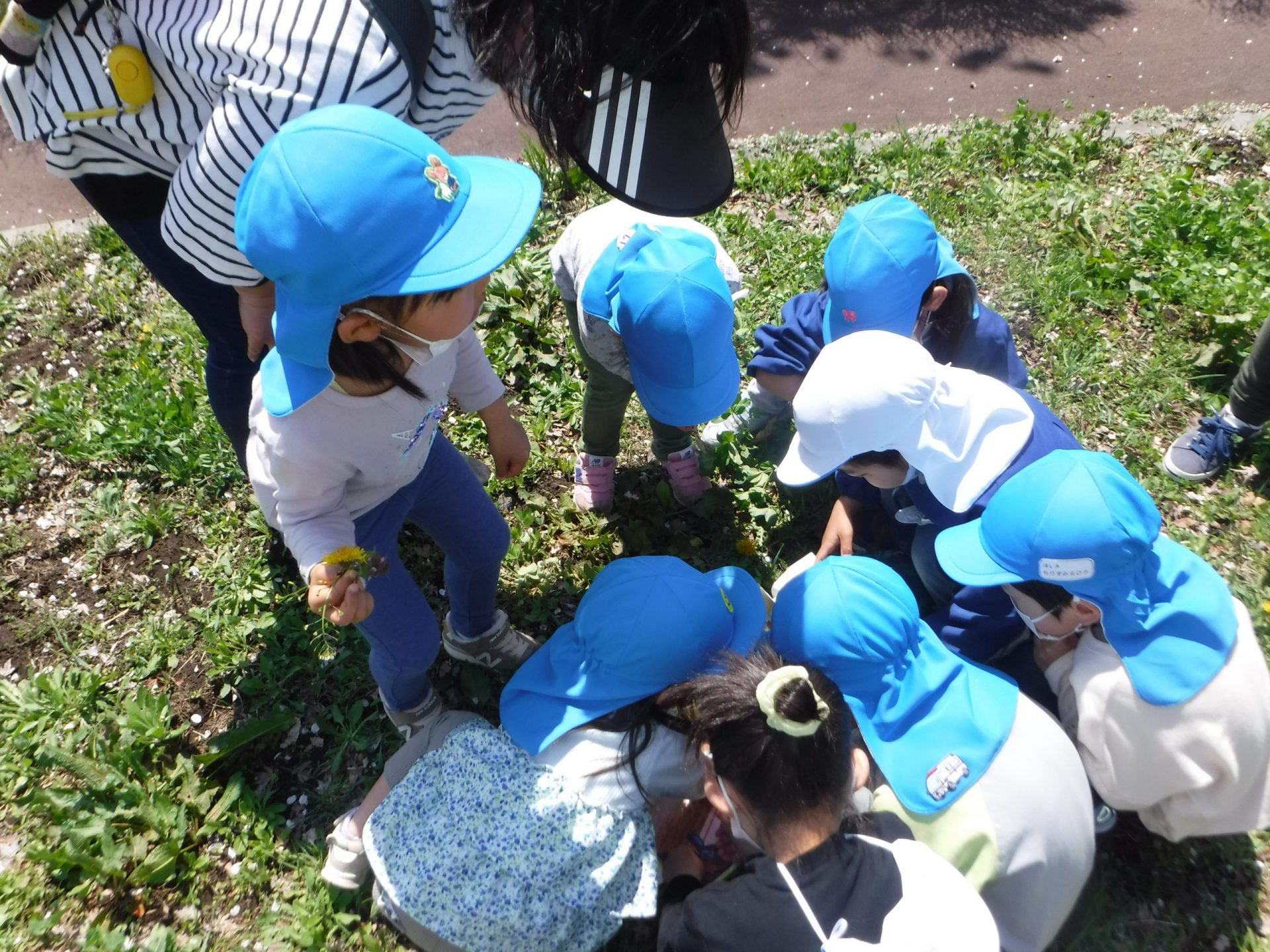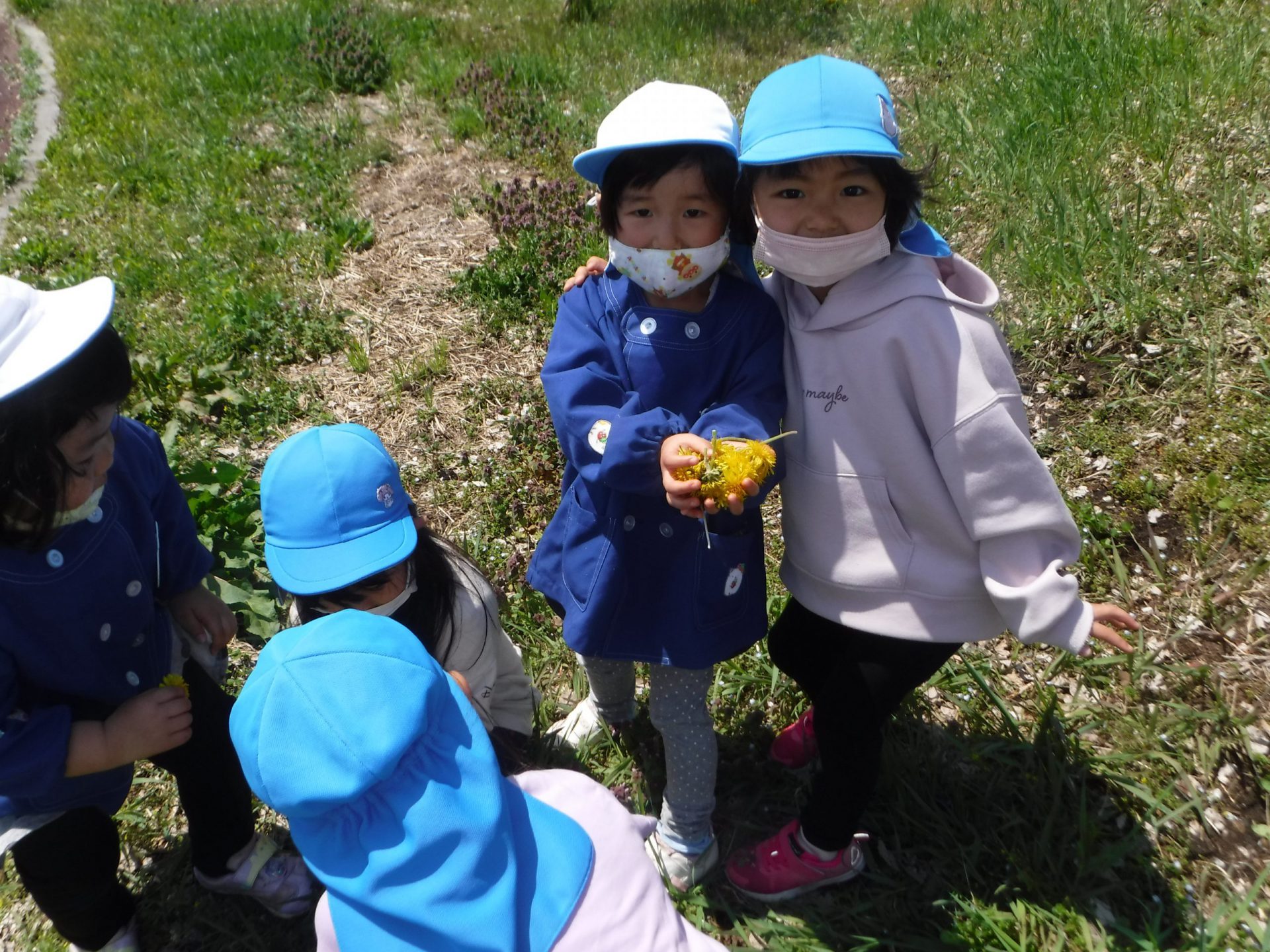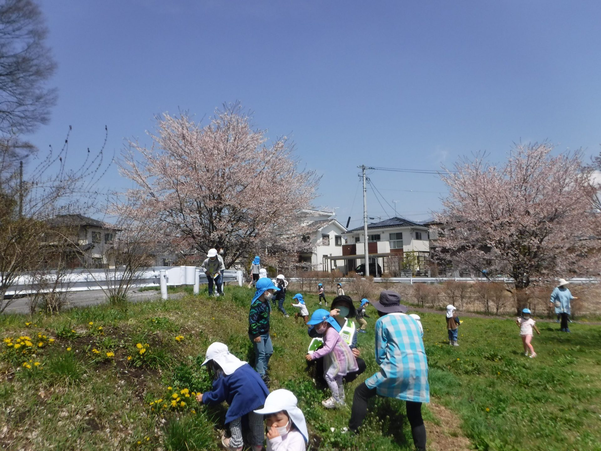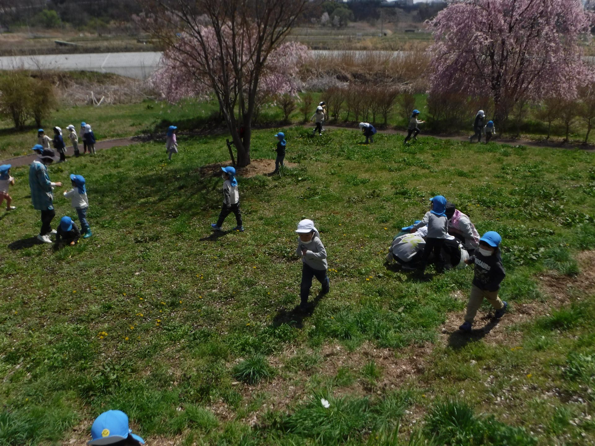 ・新年度になり、新しい環境の中で過ごし、緊張や不安もあるが、身近な慣れ親しんできた公園に出かけることで、安心感もありながら、園外の特別感も感じ、自然の中に出かけ身近な春を見つけ、興味関心を持ち楽しい時間を過ごしてほしいと願って活動をしました。