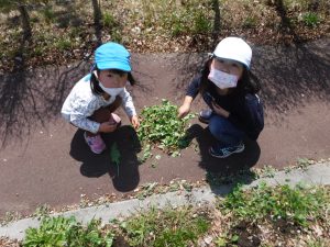 これからも、機会をみつけ身近な自然と関わるようにし、その中でいろいろな遊びの発見をしたり、身近な自然に触れる中で生命や不思議さなどを感じたりできたらと思っています。