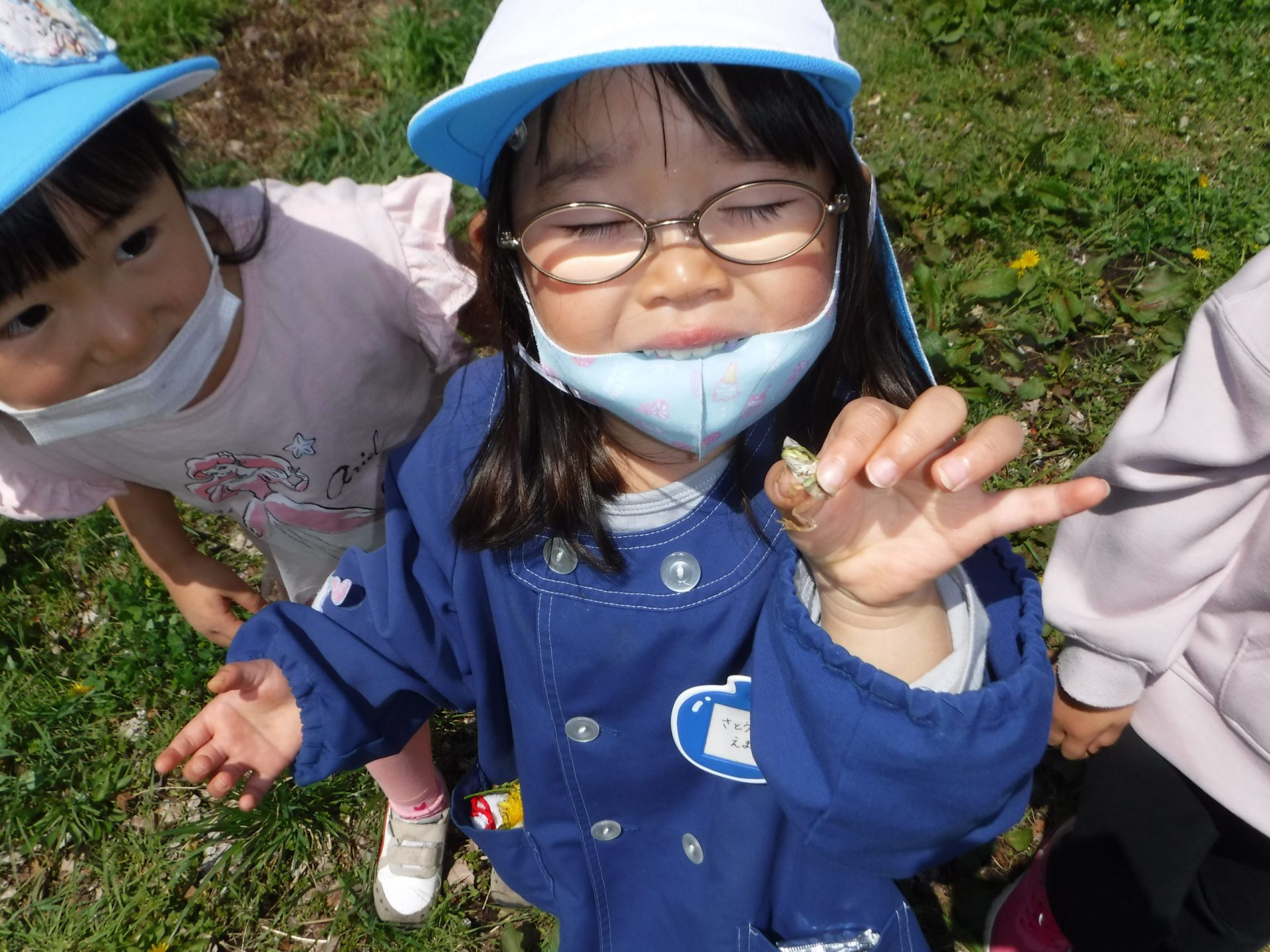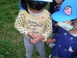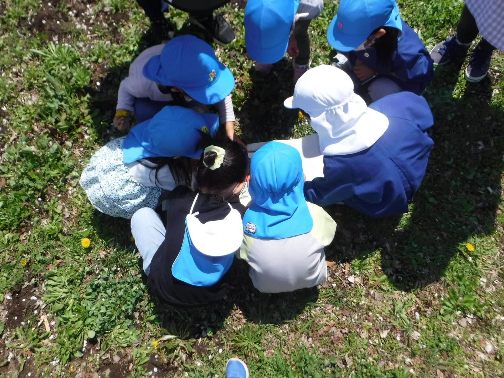 ・「かえるがいたよ!」「どこどこ?」「こっち!」「え~!」と春になって動き出したかえるを見つけたり、「テントウムシ捕まえたよ。」「わ!くすぐったい!」「手のこっち行っちゃうよ!」とテントウムシを見つけてみんなで見ている子ども達。