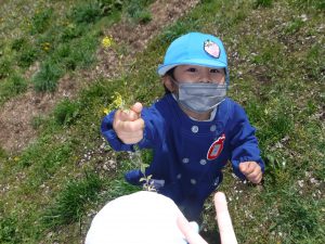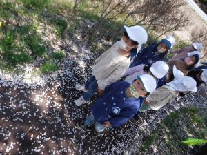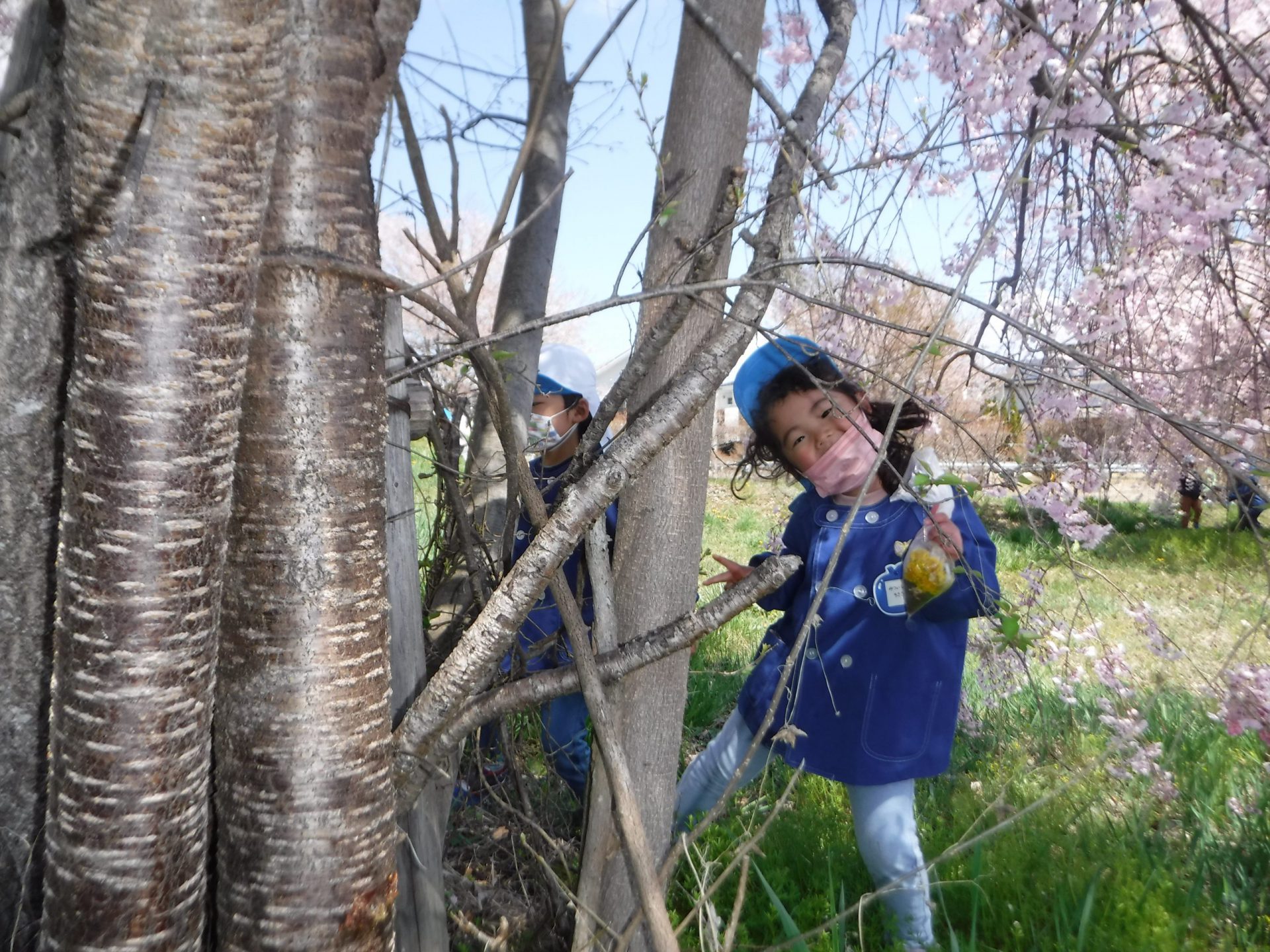 ・「みて!」「みてみて」「何かいい匂い。」「桜だらけだ!」「この葉っぱくっつくぞ!」と自分で見つけた春をそれぞれ報告に来てくれる子ども達。