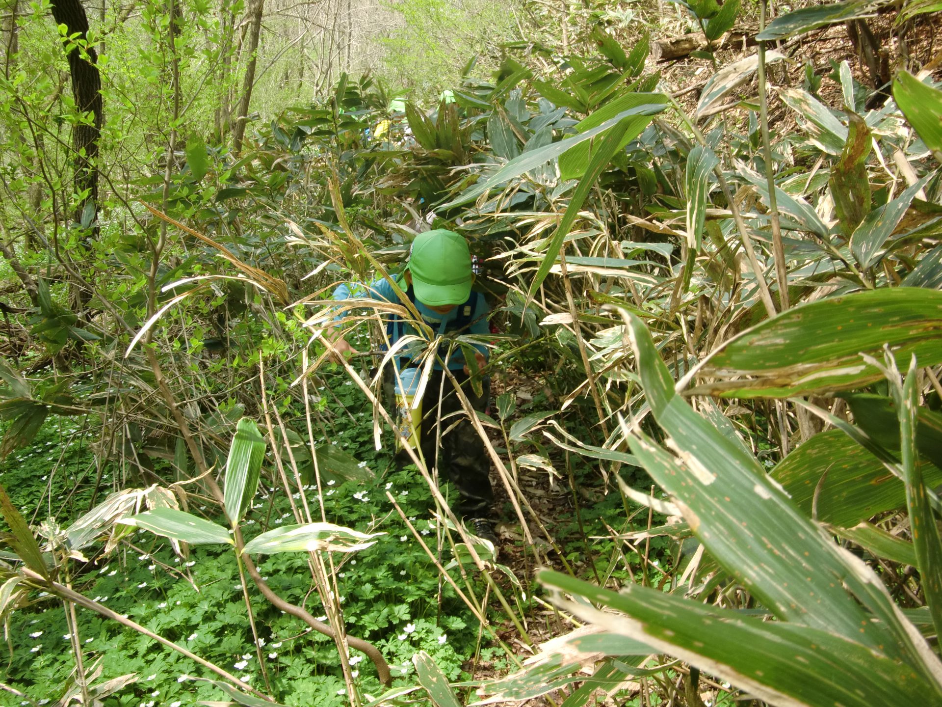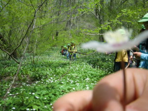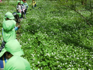舗装路が切れて、ニリンソウがあちこちに咲いています。
