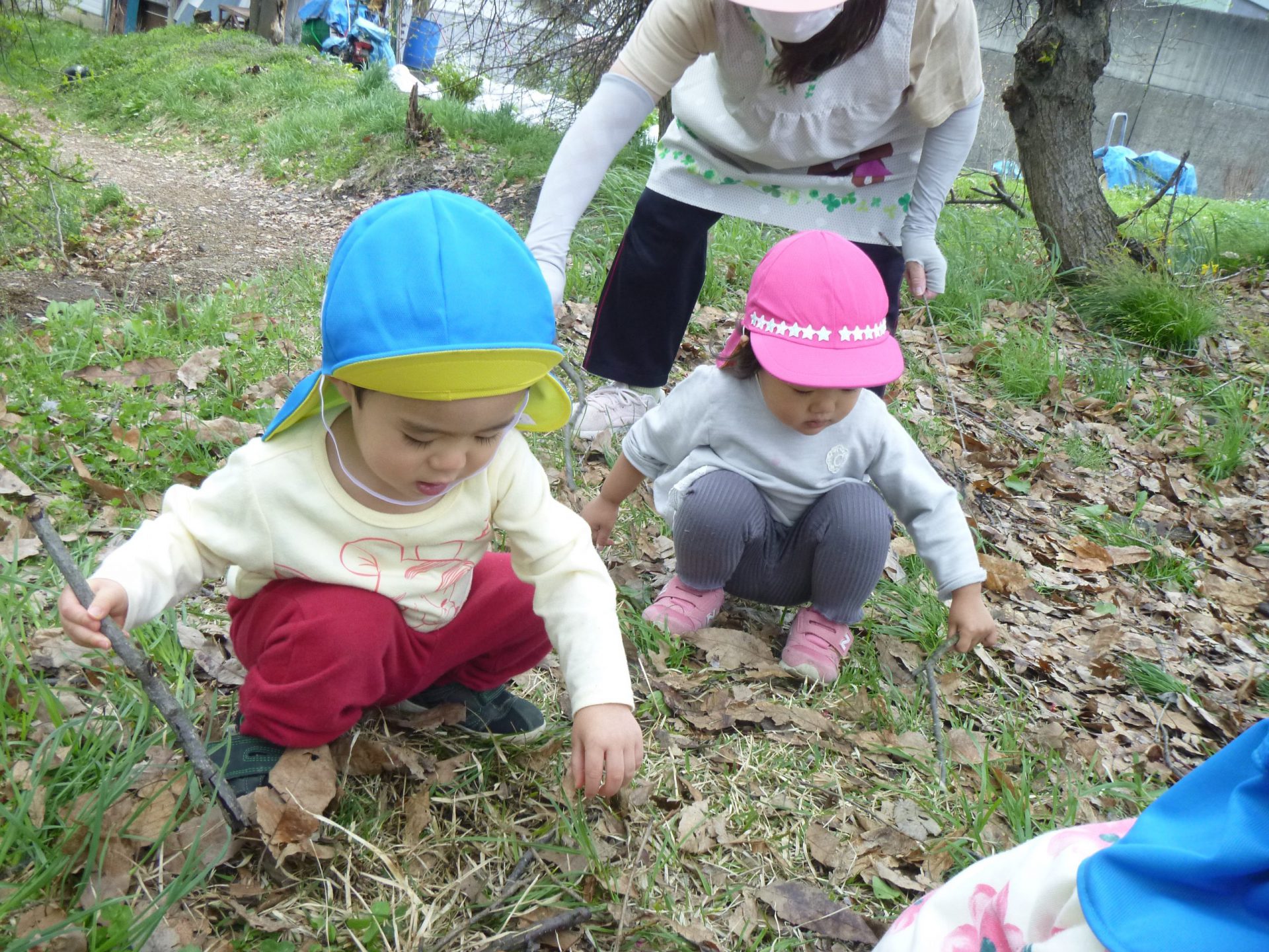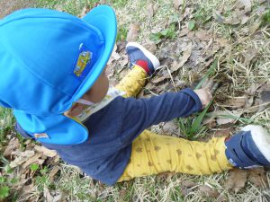 「はっぱの下にだんごむしいるかな?」   ぼう(枝)を手に持って探し始めるこどもたち。