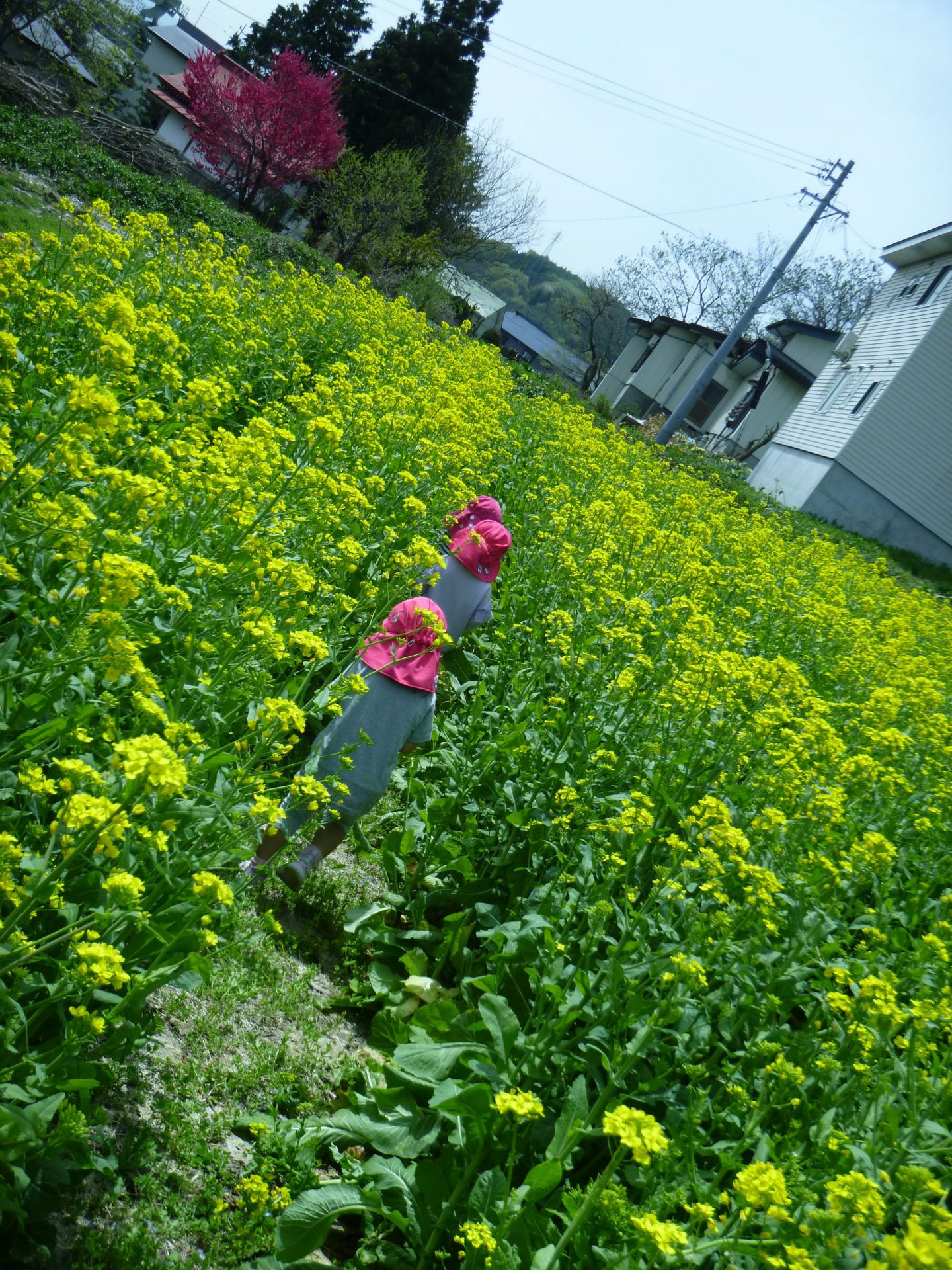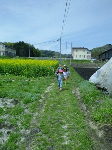 菜の花を踏まないようにそ〜っと歩く子どもたち。春ならではの自然を