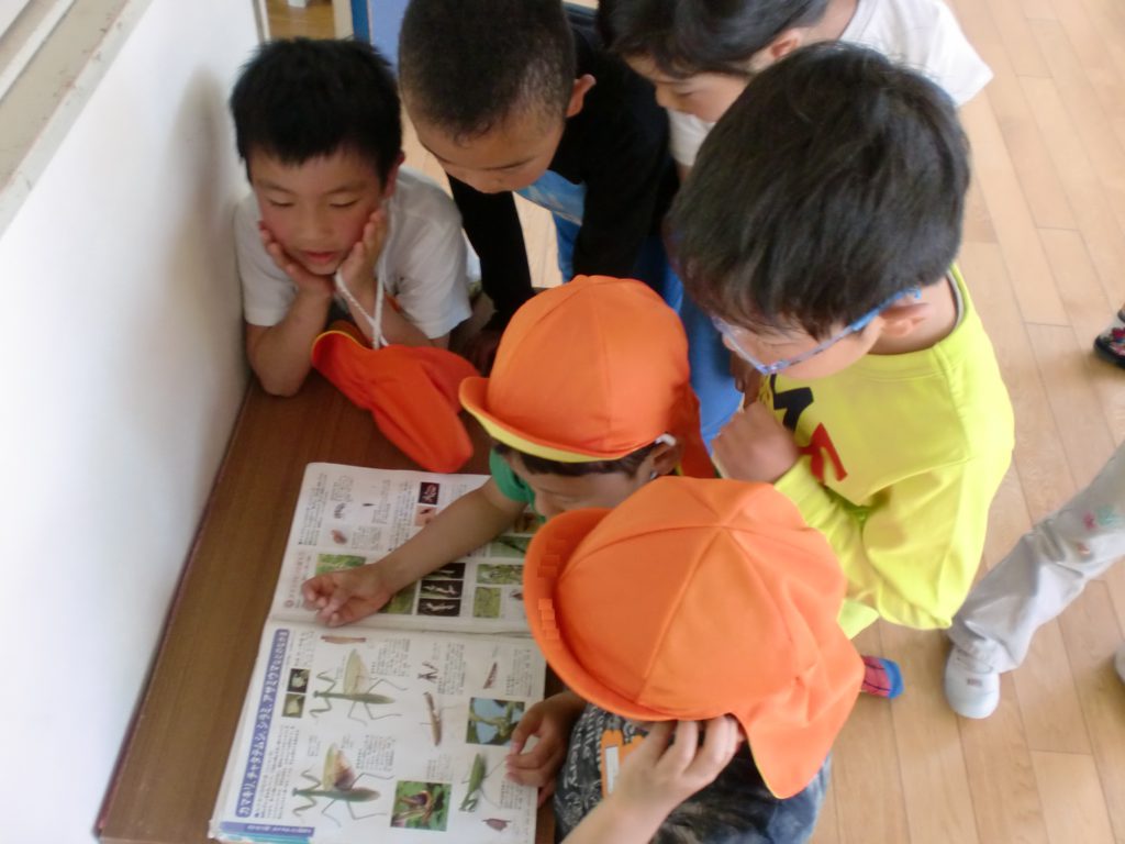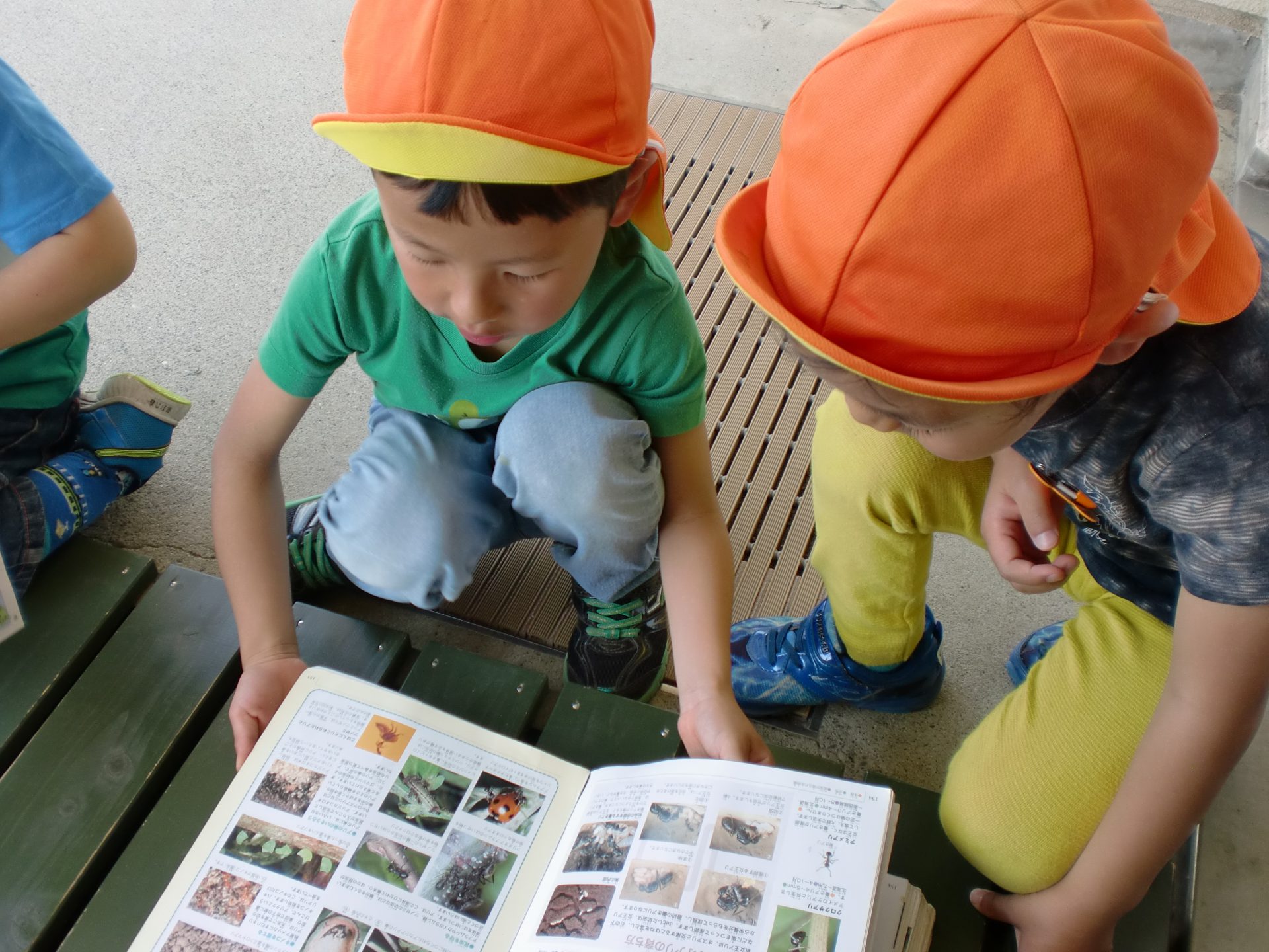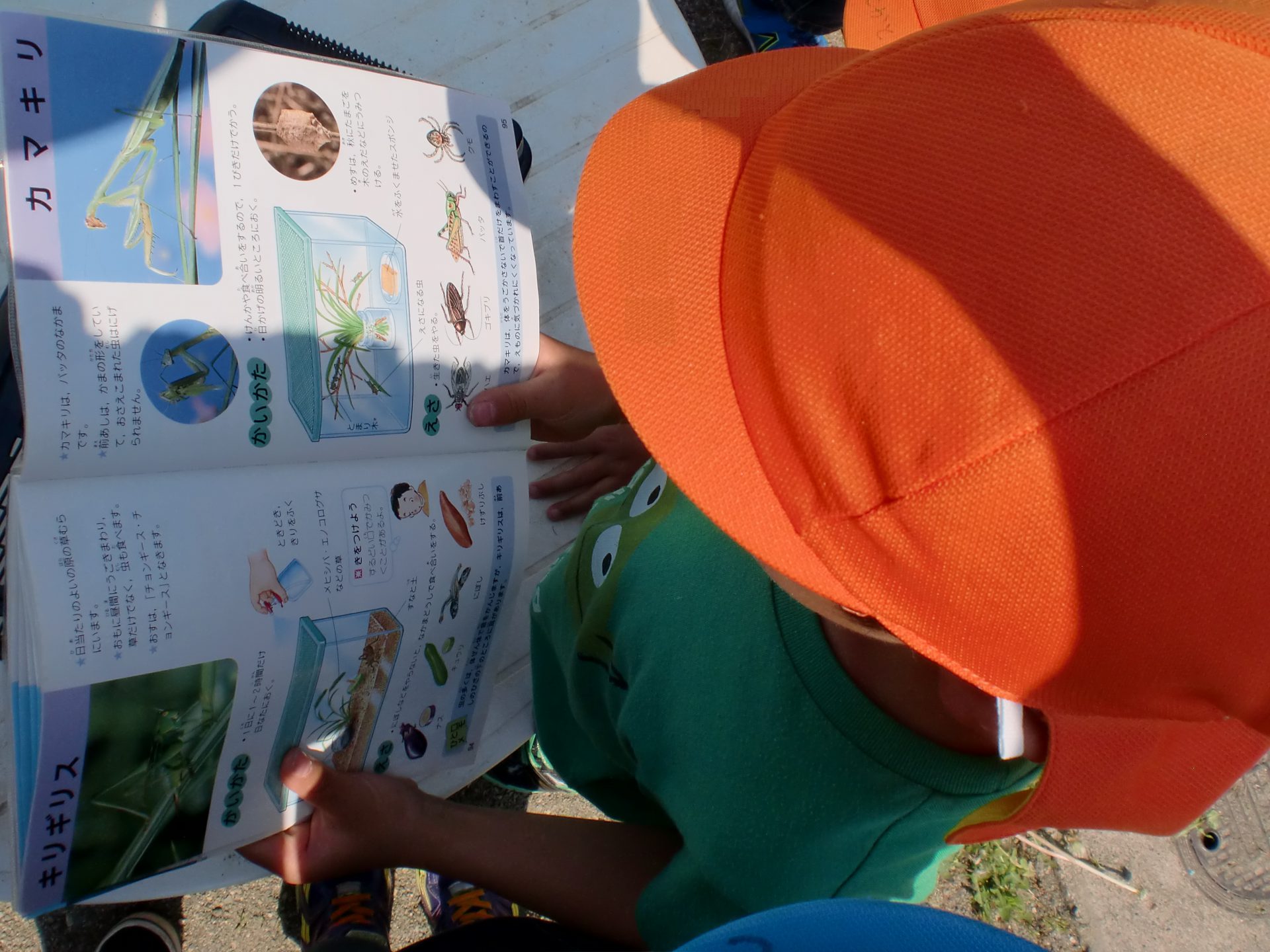様々な図鑑を見ながら、虫かごの中をどのようにしたら良いのか調べ、同じように用意したり、餌も必要だということになり、捕まえに行ったりしていました。