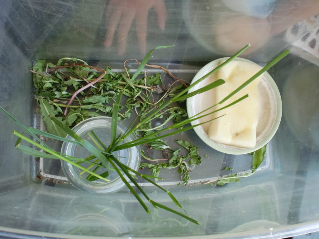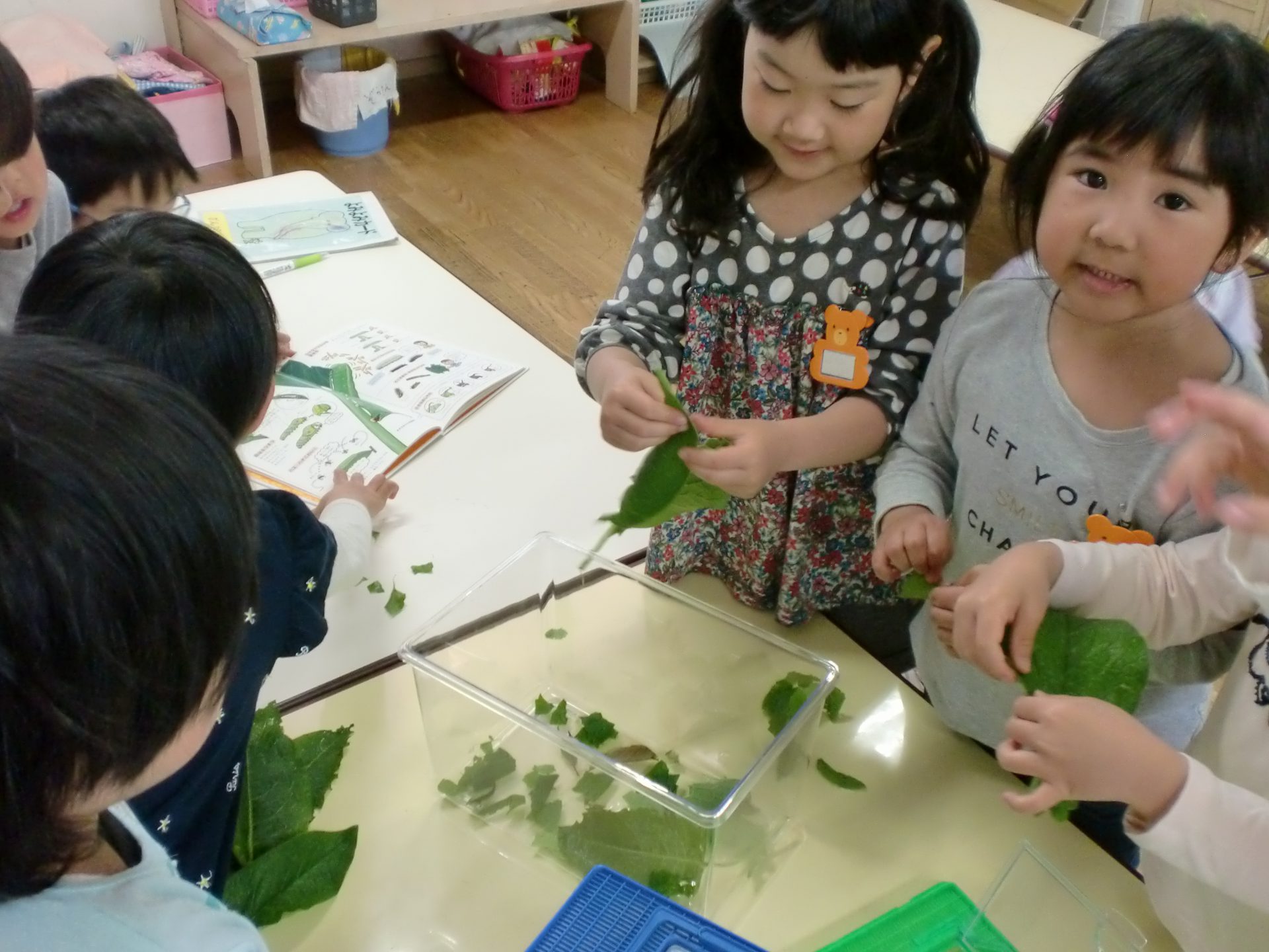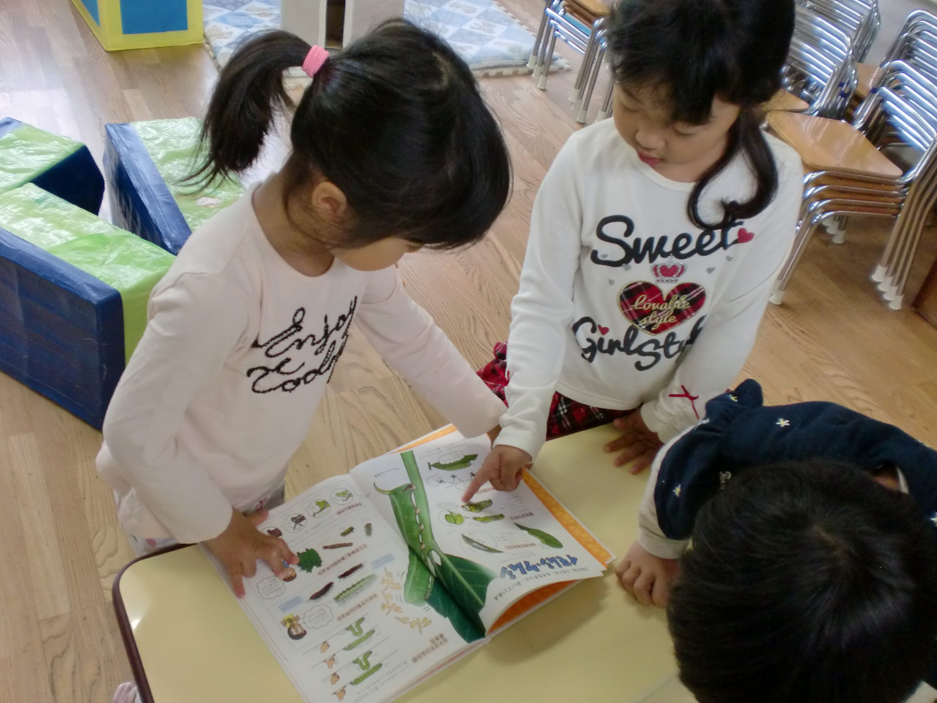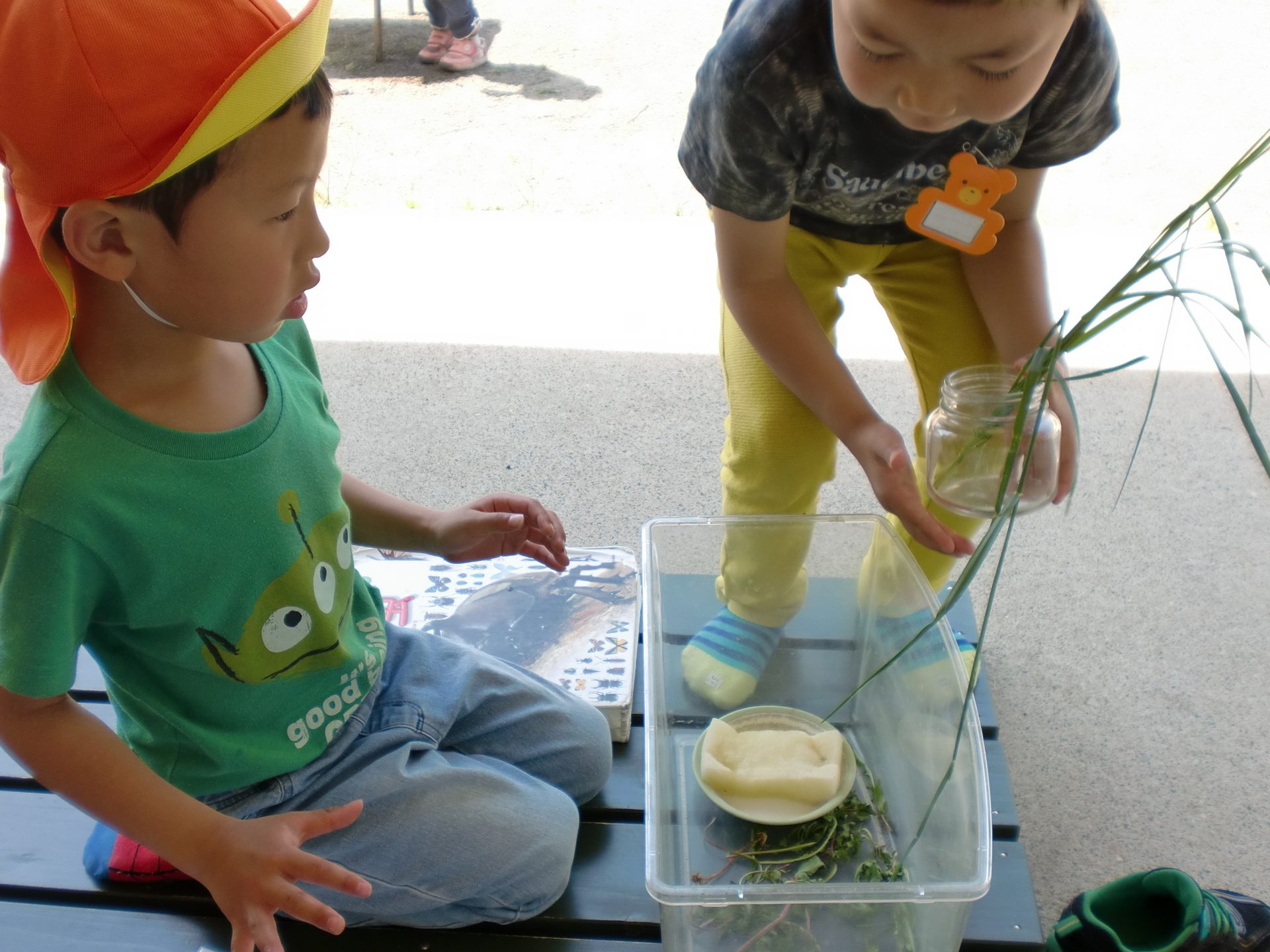 様々な図鑑を見ながら、虫かごの中をどのようにしたら良いのか調べ、同じように用意したり、餌も必要だということになり、捕まえに行ったりしていました。