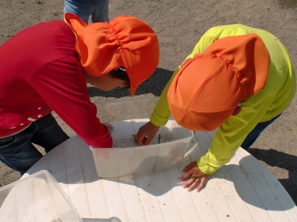 生まれてきた、赤ちゃんカマキリを別の虫かごにそっと入れ飼うことにした子ども達。