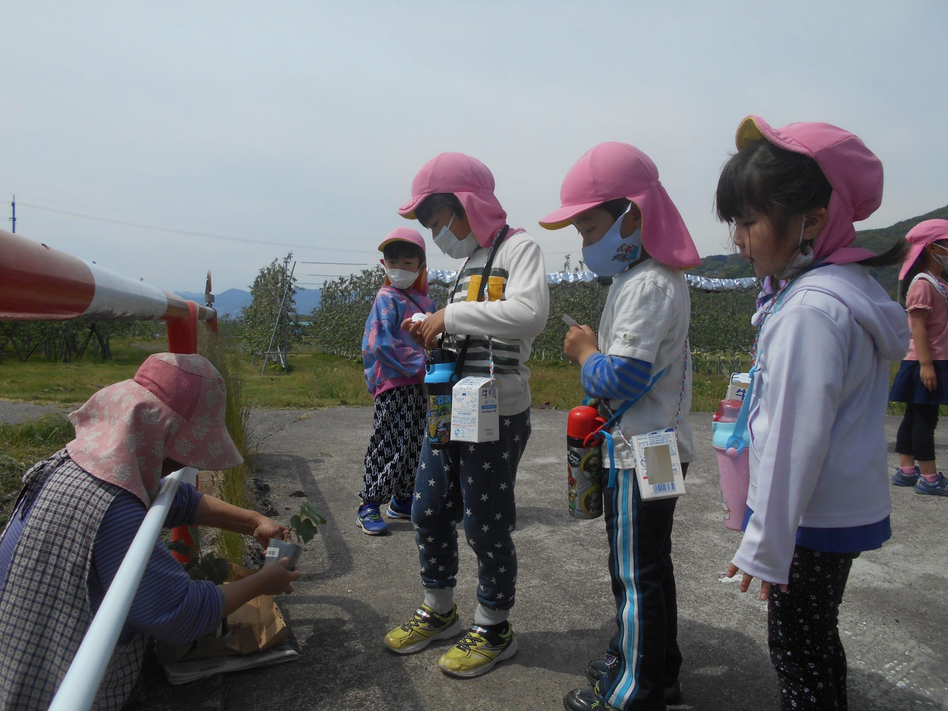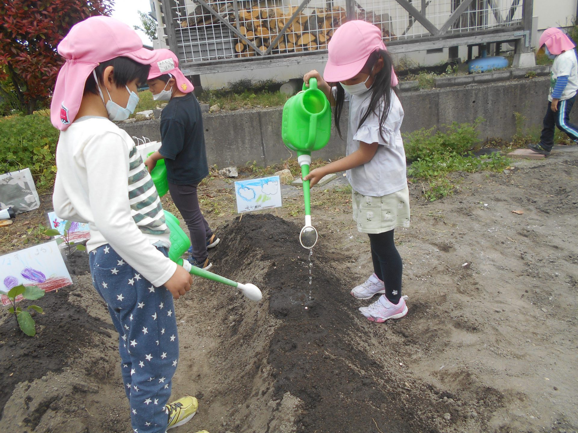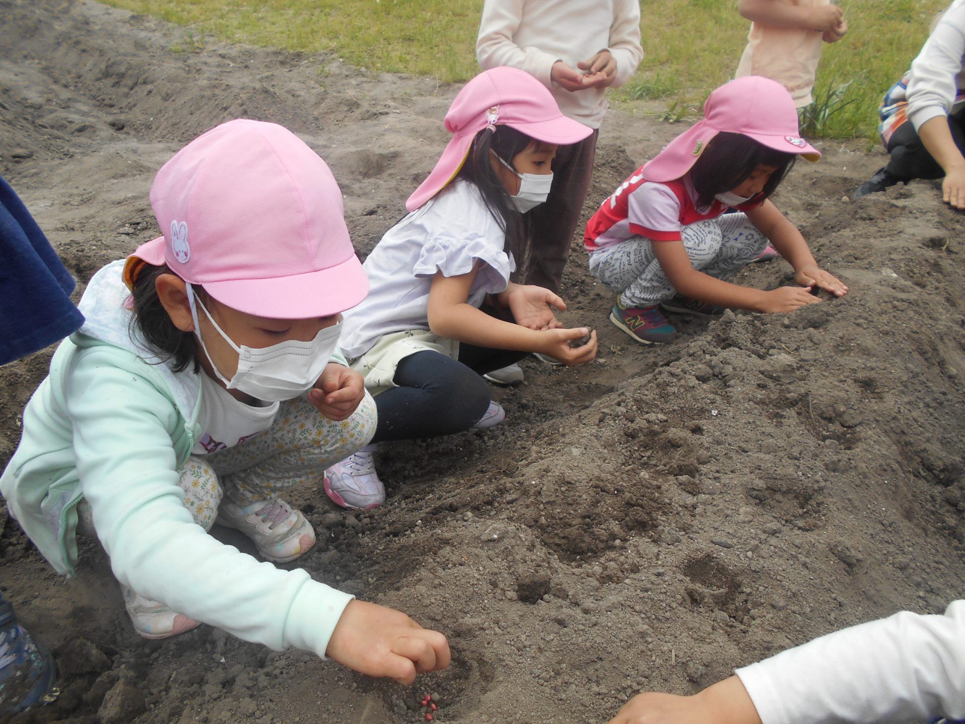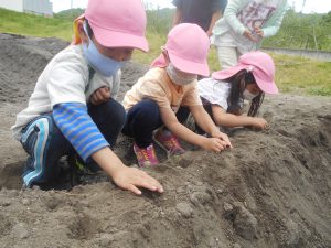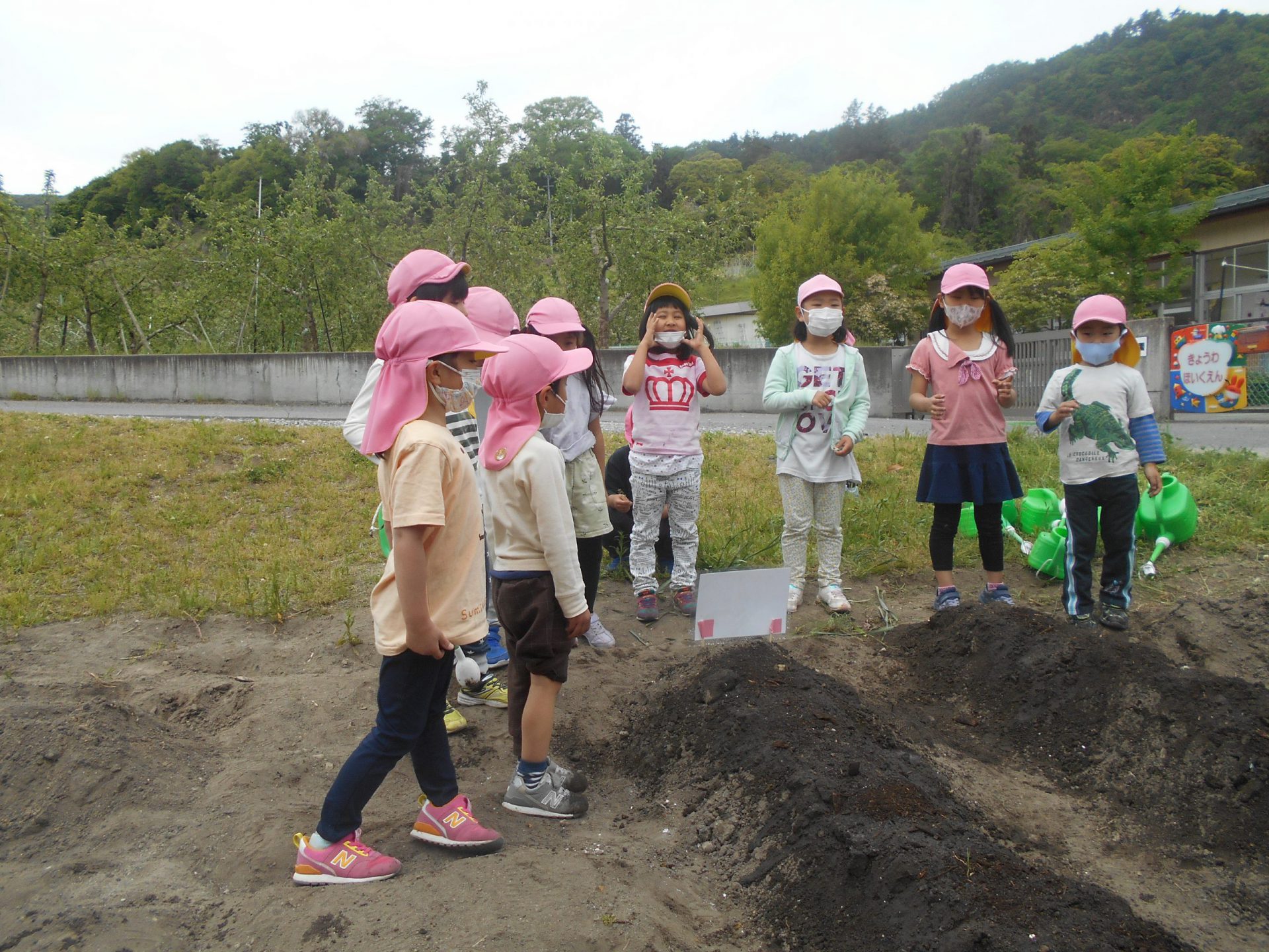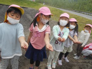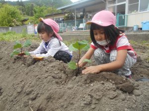 ・畑づくりをする中で、生長する様子を見たり、お世話をしたりしていくことで食べ物へ興味、関心を持ち、食べ物を大切にする気持ちや作ってくれる人への感謝の気持ちが育ってほしいと思います。