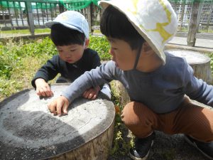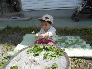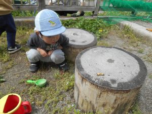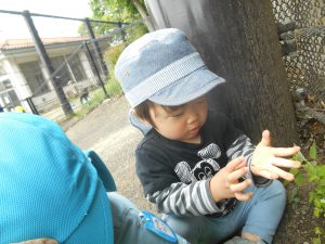 昨年度からの子どもたちは1年間、草花や虫などにたくさん触れてきた経験があり、進んで触れたりし「じー」っと眺めたりと自然に親しむ姿がみられます。そんな友だちの姿を見て、近くで一緒に見たり少し触れてみたりする姿もそれぞれの子どもたちにみられるようになってきました。