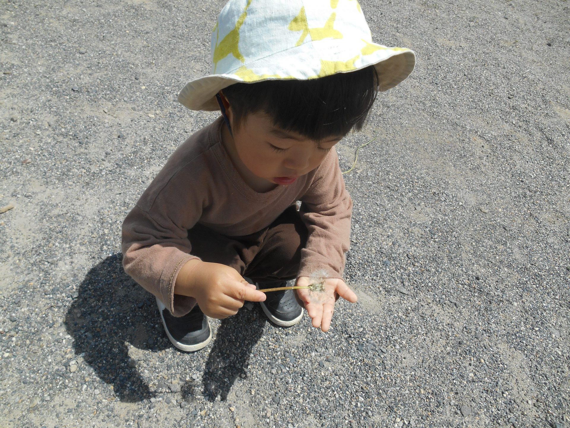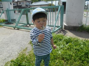 戸外に出ると白つめ草やたんぽぽ、クローバーなど様々なものに興味をもち、見たり触れたりしています。
