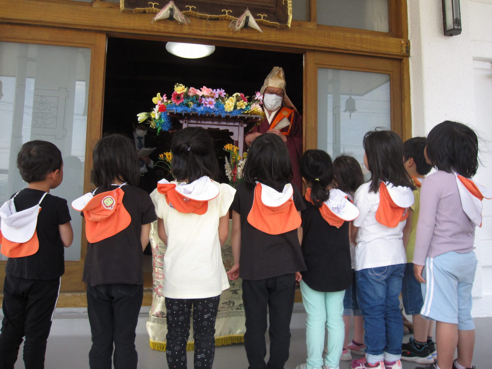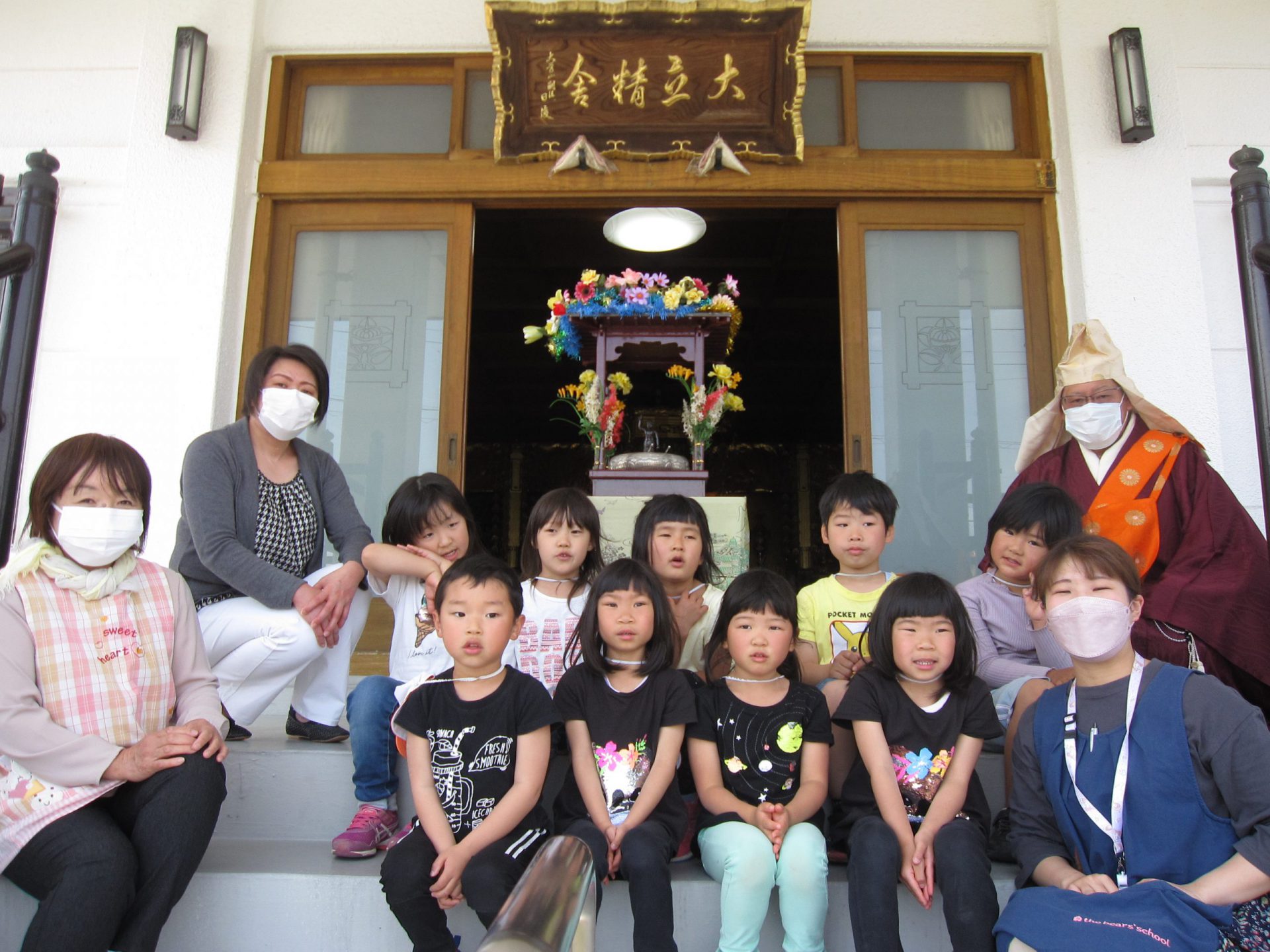 毎年、お花まつりと七五三にお声をかけていただき大立庵さんにお邪魔しています。コロナ禍の中、地域の方とお会いする機会が減っています。職員以外の方にお会いしお話を聴くことは貴重な経験かと思います。「三毒」のお話は、これから子どもたちが成長していく中で大切な事がたくさん含まれていると思います。住職さんのお話にじっと耳を傾ける姿を後ろから見ていて、そのお話がしっかり子どもたちの中に入っていっていることを感じさせる子どもたちの後ろ姿でした。元気にたくましく、そしてやさしく等・・・子どもたちに願うことは数知れません。が、まずは笑顔で登園し保育園で好きな遊びを十分し満足してもらえたら・・と思います。