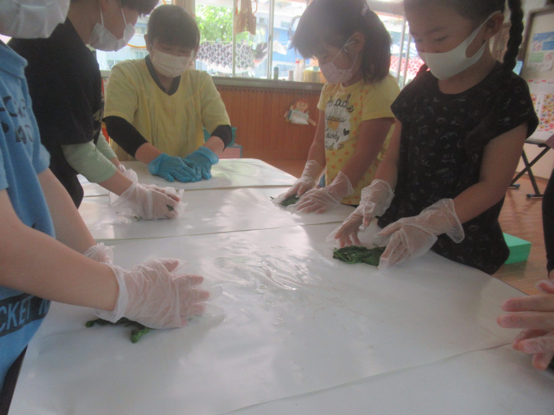 はじめは生の葉っぱだったのが、ホットプレートで煎ることで、パリパリに乾いていくのを見て、お茶っ葉をもむ手にも力が入っていました。