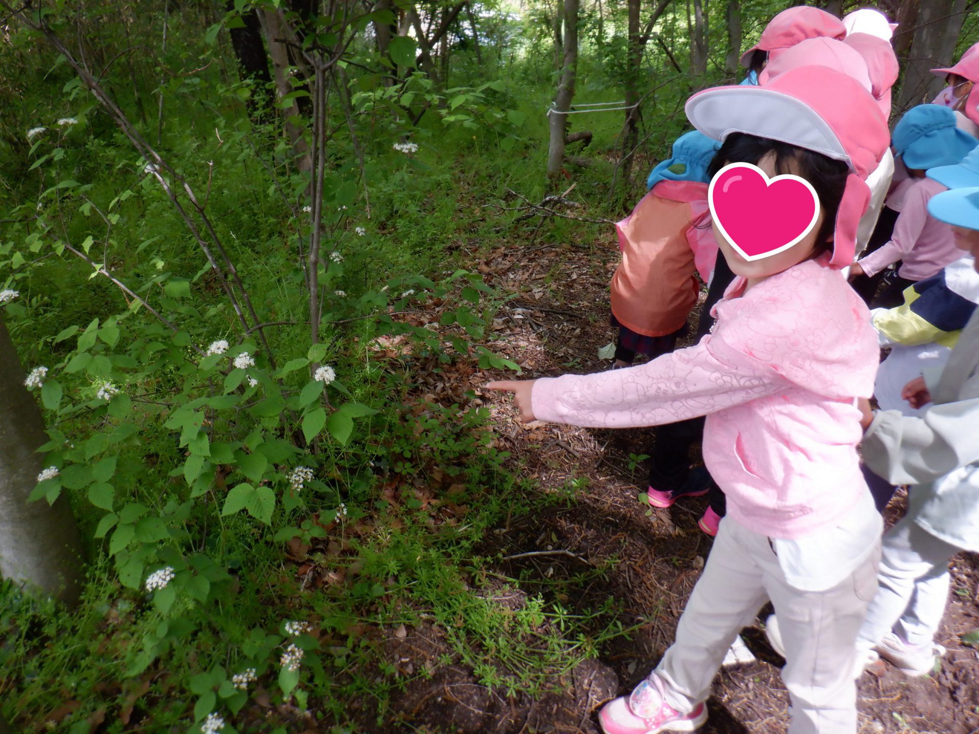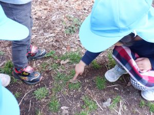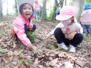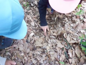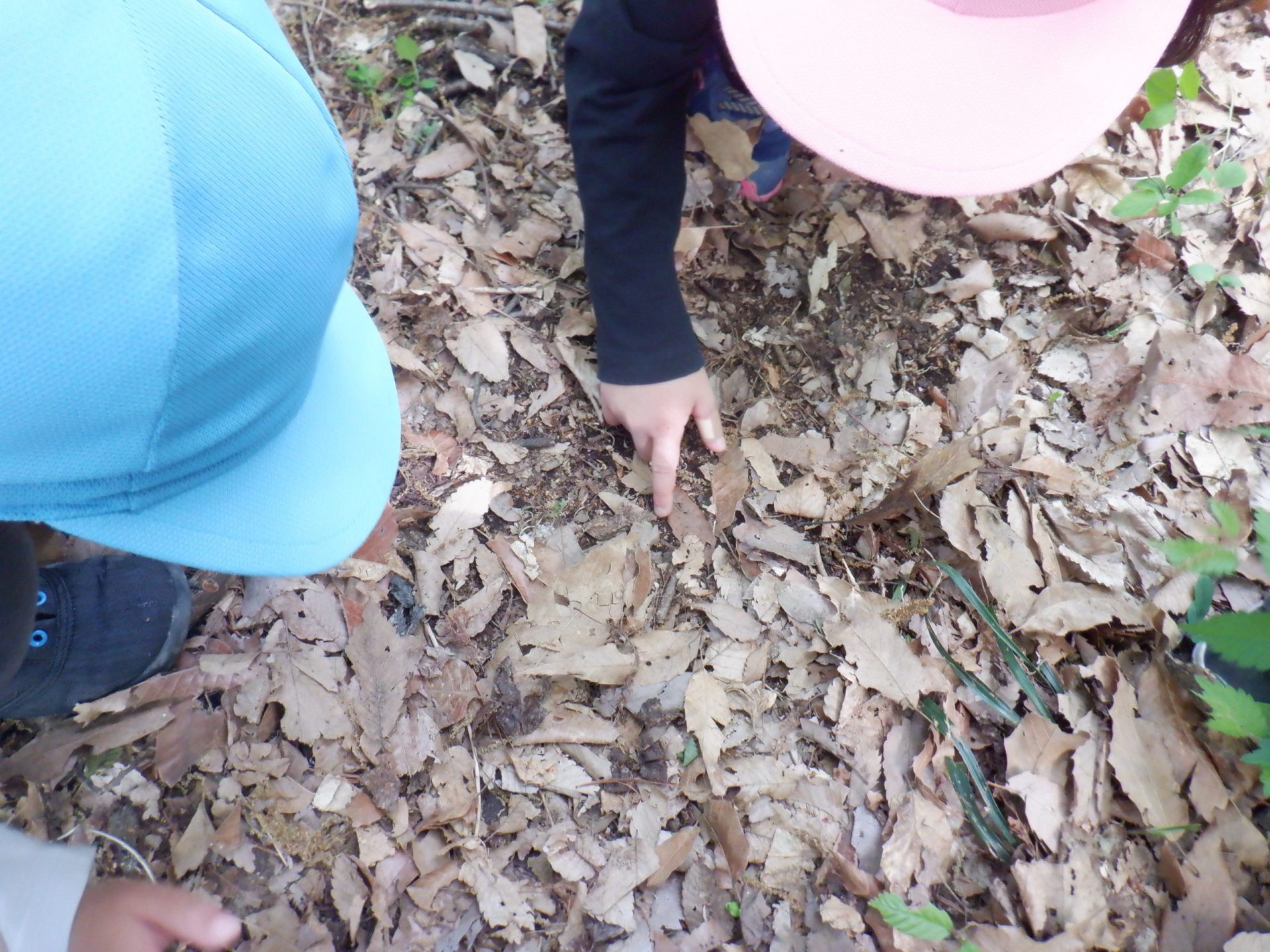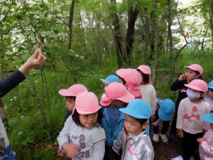 山で遊び慣れている年長児に色々なことを教えてもらい年少児は目をキラキラさせ一生懸命に聞いていました。