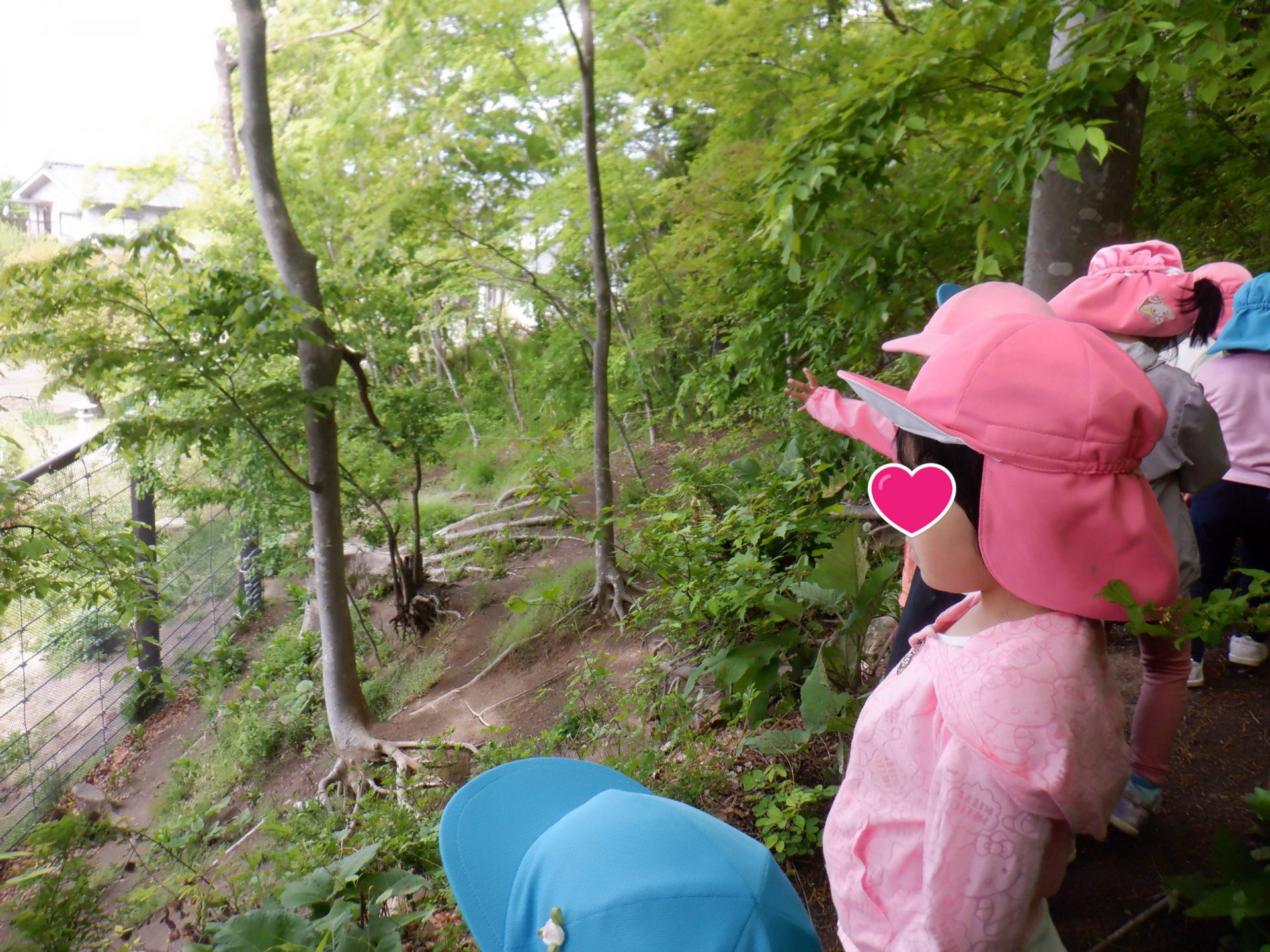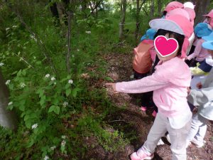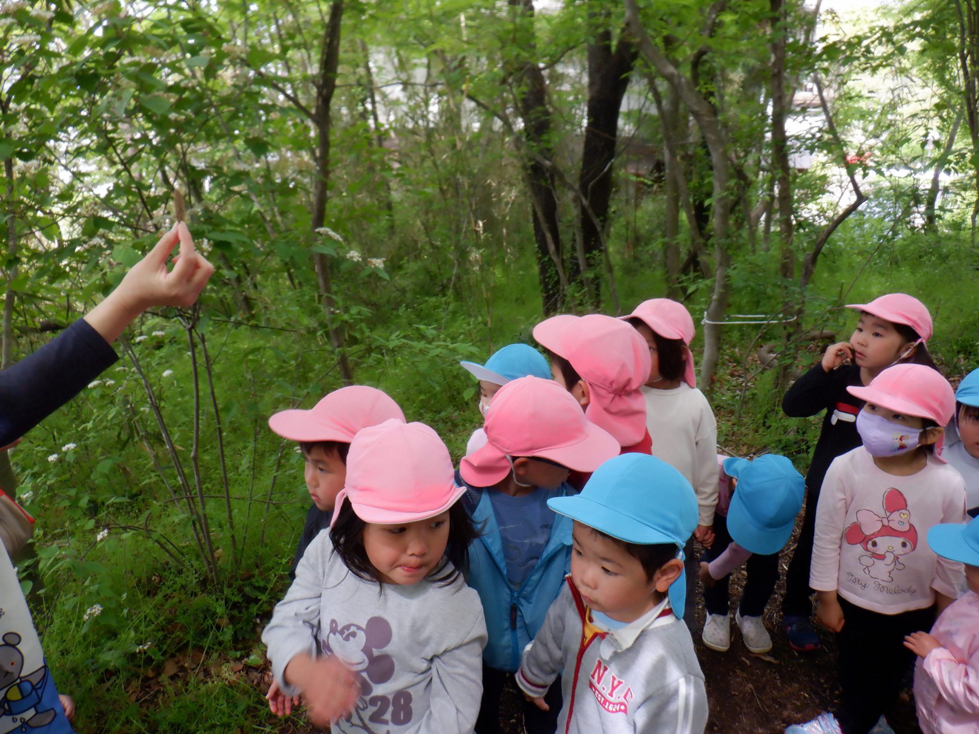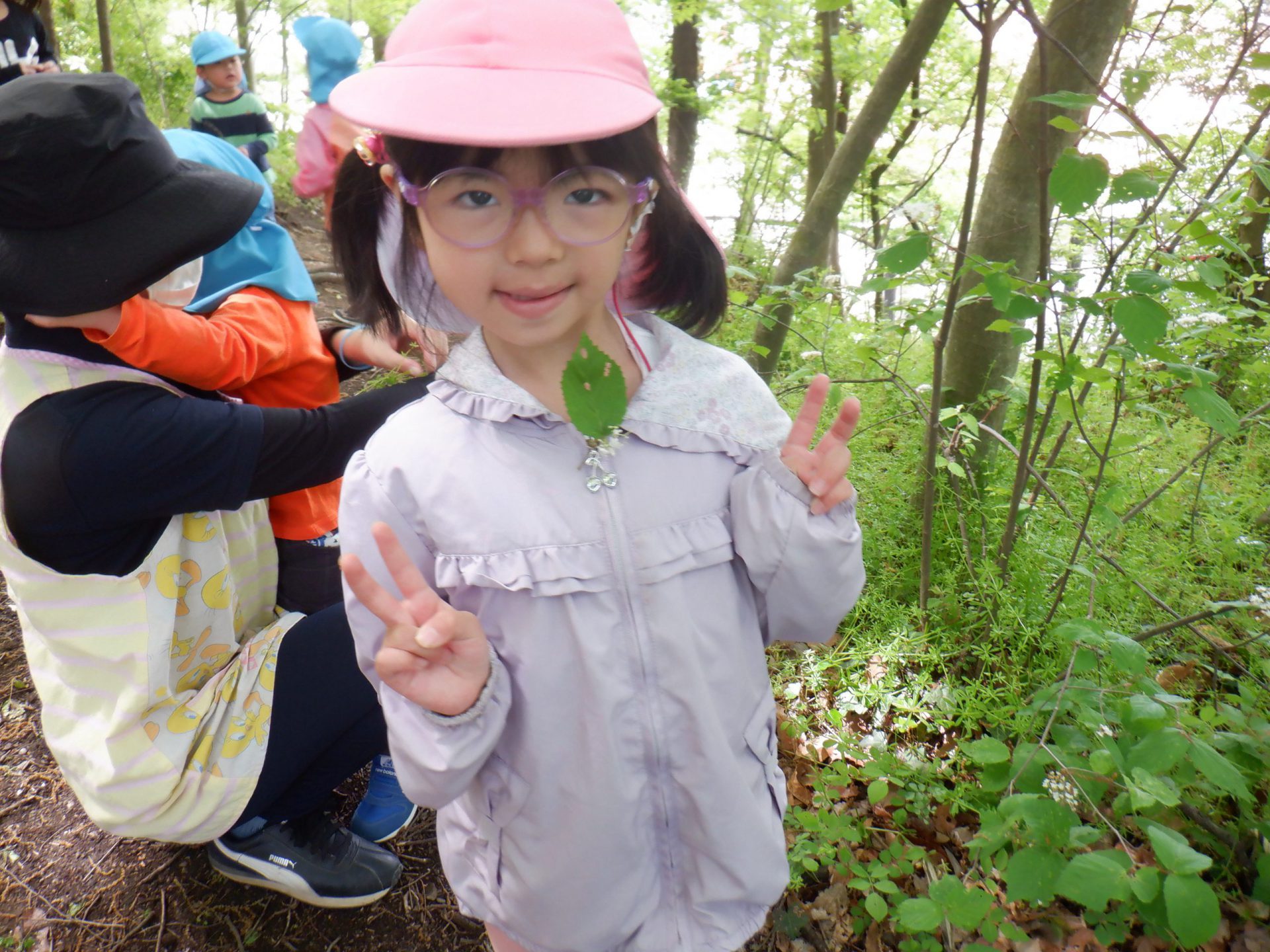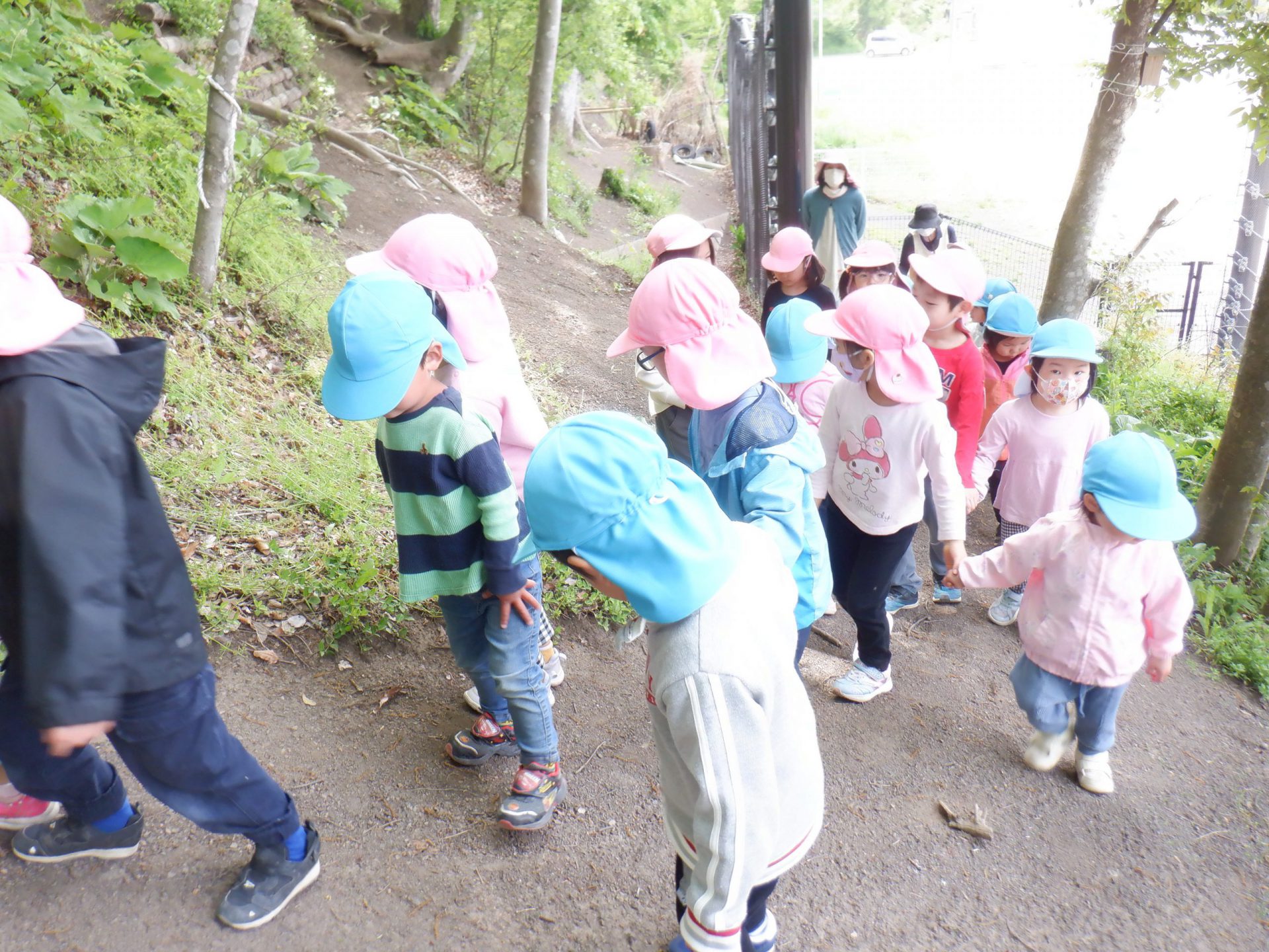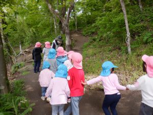 年長児に優しく手をつないでもらい、年少さんもはじめて裏山に登ってみます。ずっと憧れていたので朝からとても楽しみ。