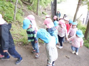 昨年から山登りを楽しんできていた進級児も山の感覚を思い出しながら一歩一歩うれしそうに登っていました。これからも当園ならではの体験を年上児に教えてもらいながら一緒に楽しんでいきたいと思います。