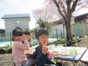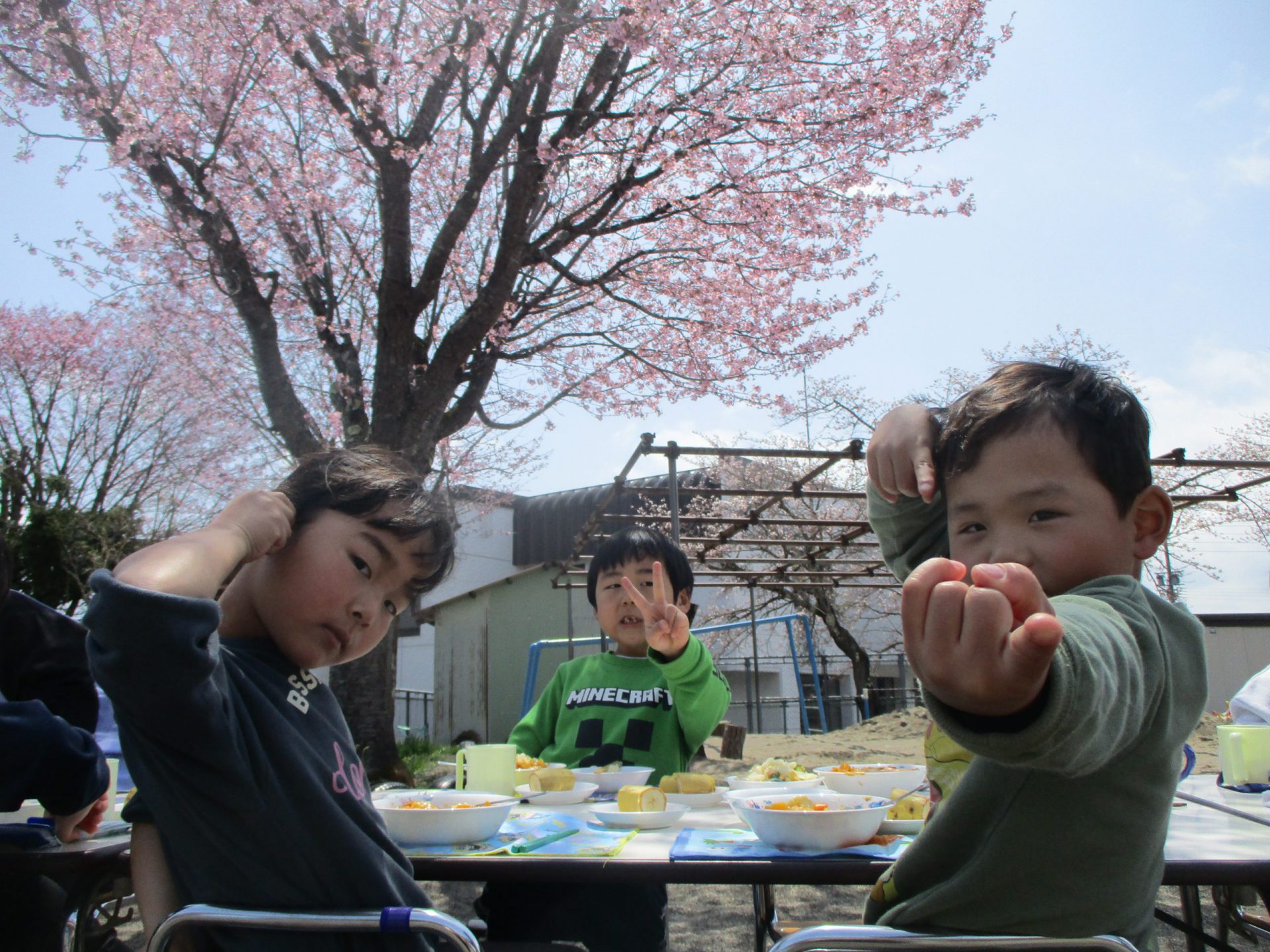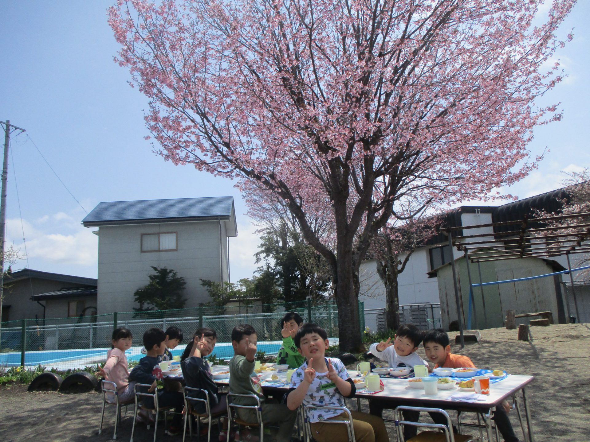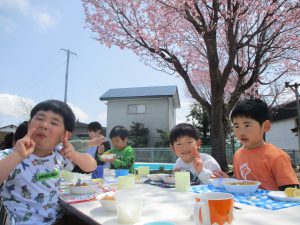 「桜のお花綺麗だね」「お外で食べるとおいしいね」