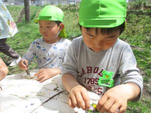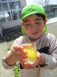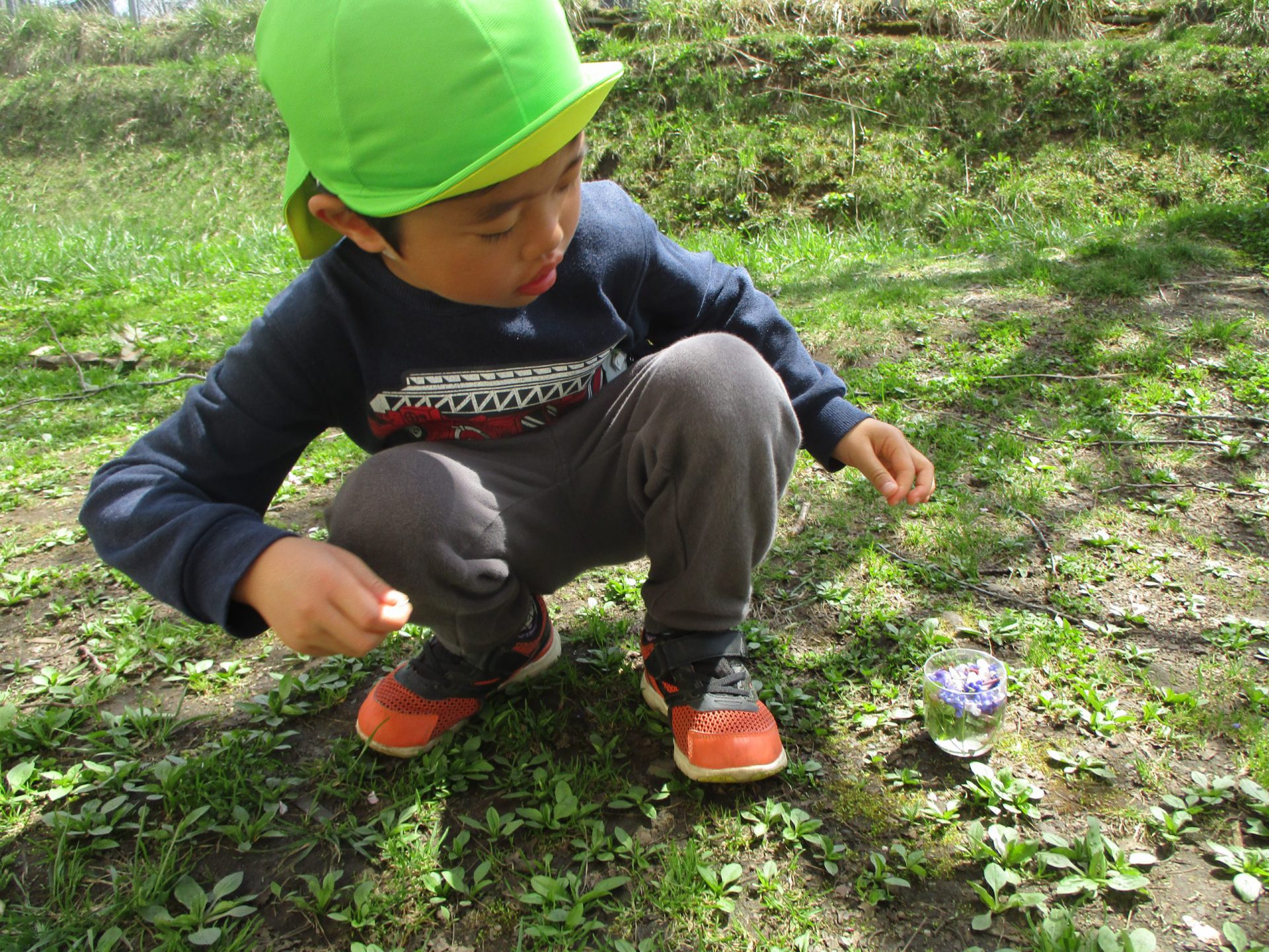 桜の花びらだけでなく、園庭に咲いていたたんぽぽや、白い花が咲くぺんぺん草などを見つけては「このお花もあった〜!」と探していれていました。