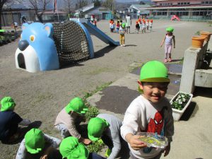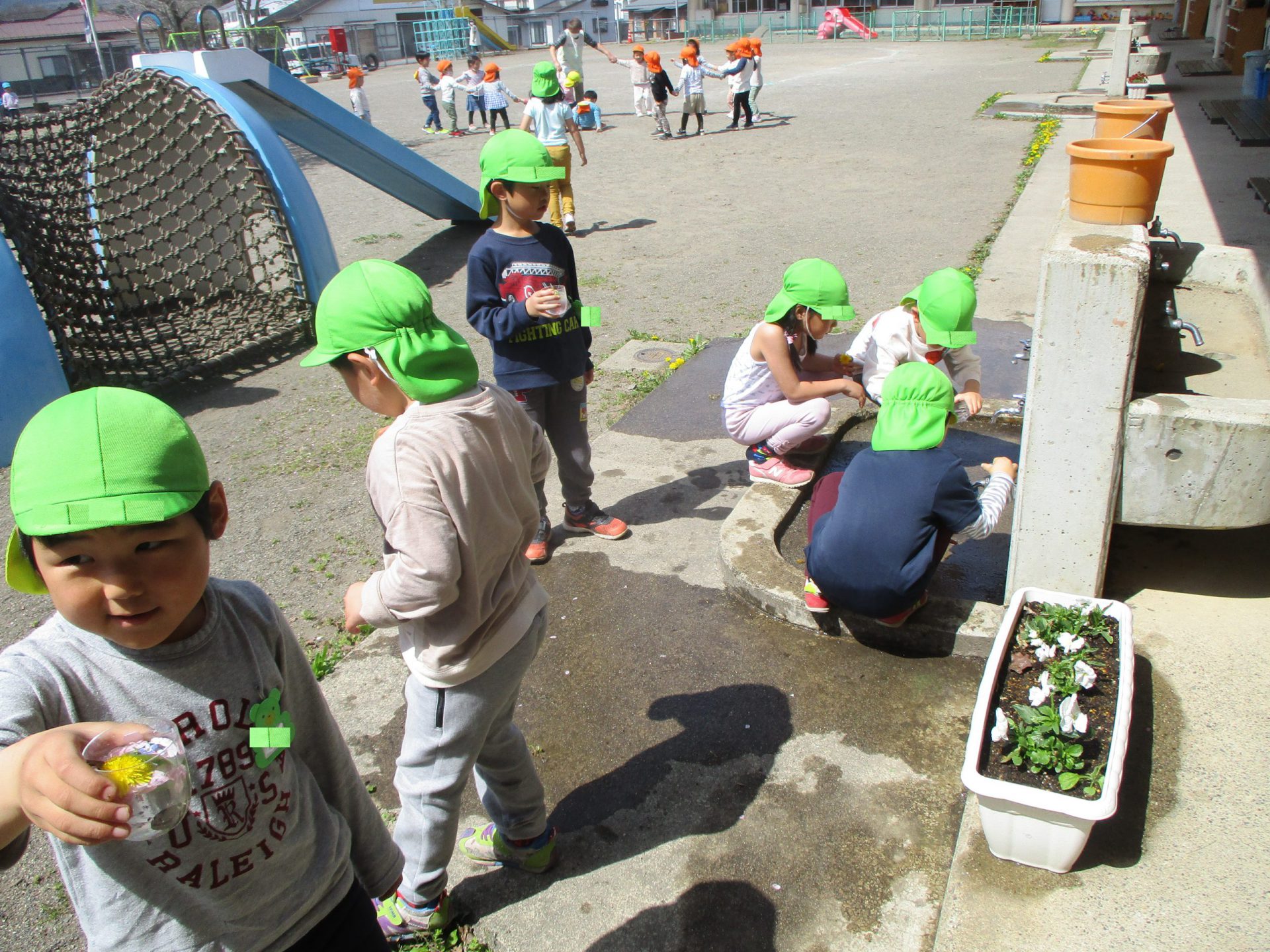 昨年子どもたちが植えたチューリップの花も咲き、色や形の違いを観察しながら水やりのお手伝いを張り切って行っていました。