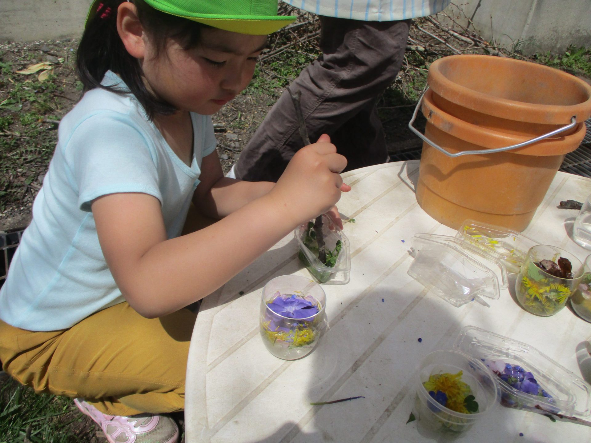 横では、「前にお花で色水したよね!」と去年のことを思い出して、潰してみていました。