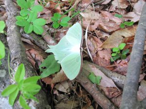 「せんせい!きから おちちゃった!!」駆けつけてみると”オオミズアオ”が飛ばずに落ち葉の上に落ちてしまっていました。