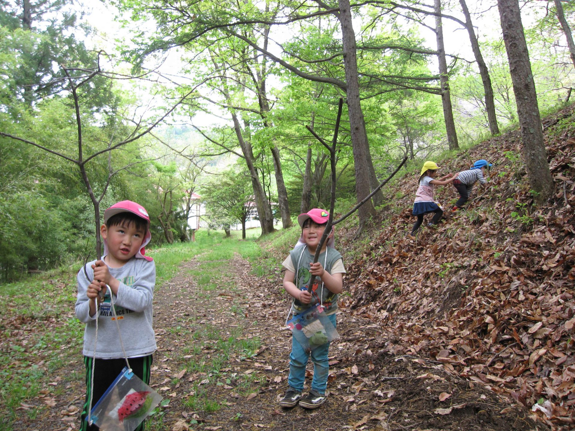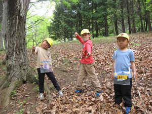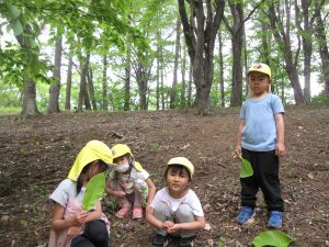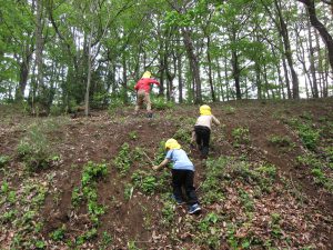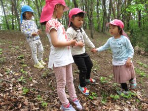 ・3・4・5歳児で裏山に行きましたが、斜面を登ろうとするこのお手伝いをしてくれる子や、一緒に生き物探しをしている子たちなど、自然に異年齢の交流が見られました。