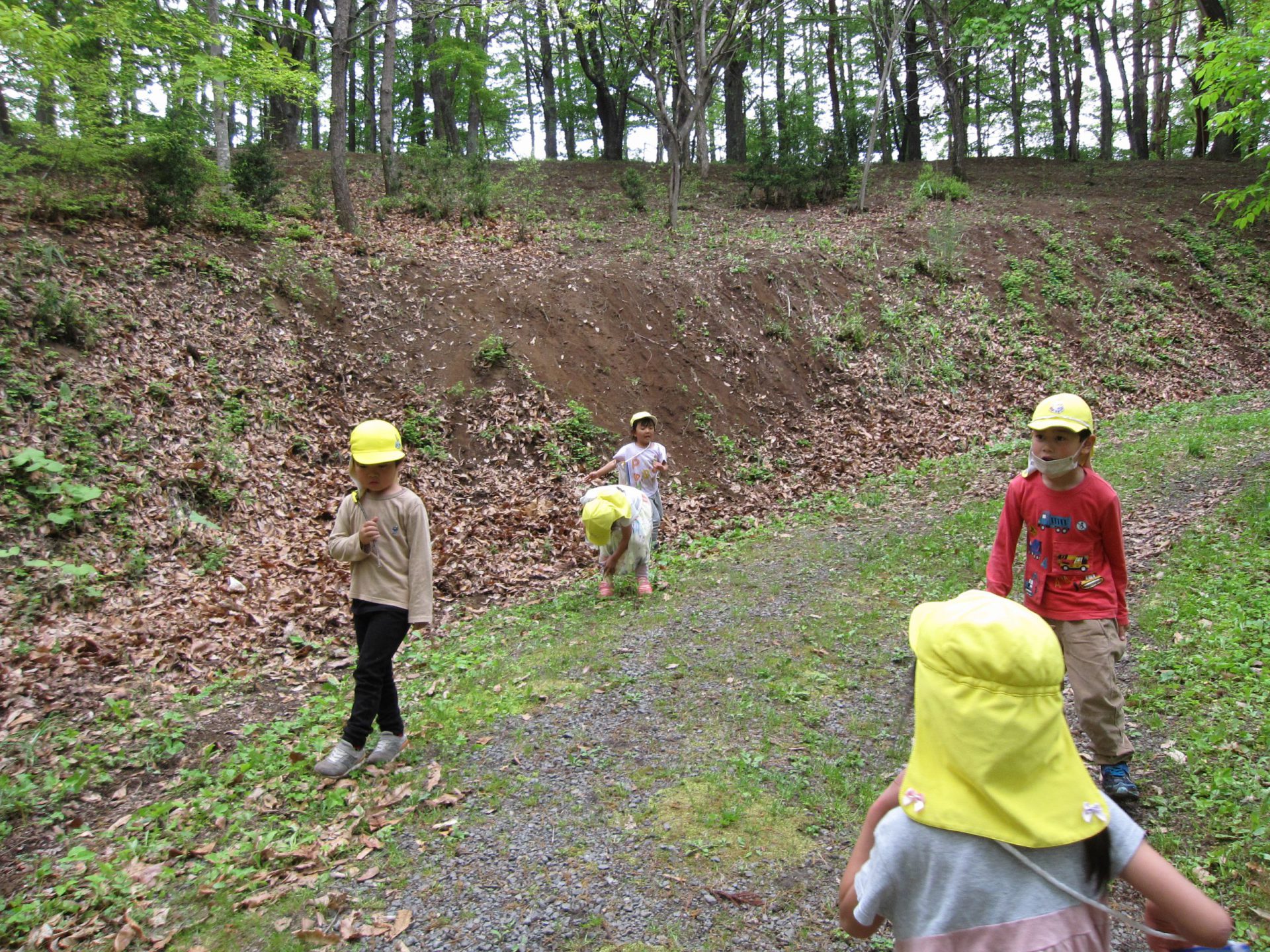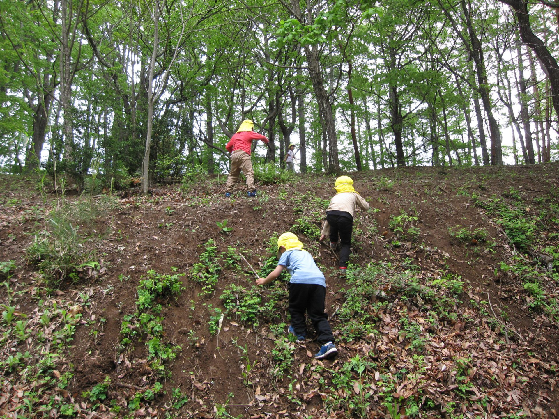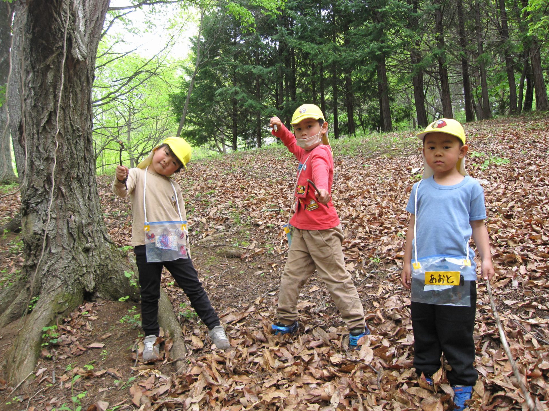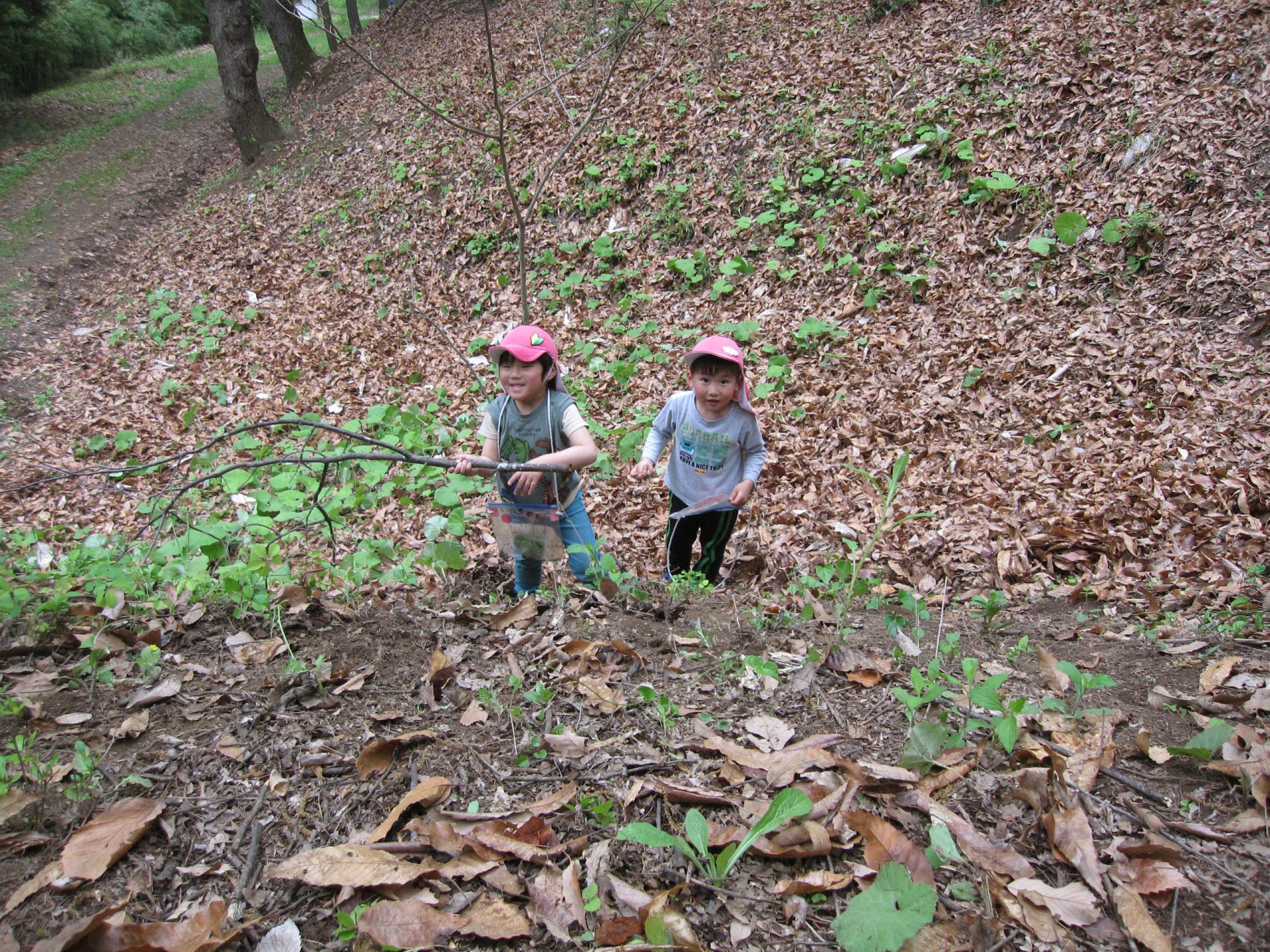 5月のある日、雨上がりに保育園のすぐ近くの裏山へ、みんなでお散歩。