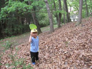 長い枝を見つけて、カエル探しをしたり、雑木林の中で鬼ごっこをしたり、遊びはつきません。