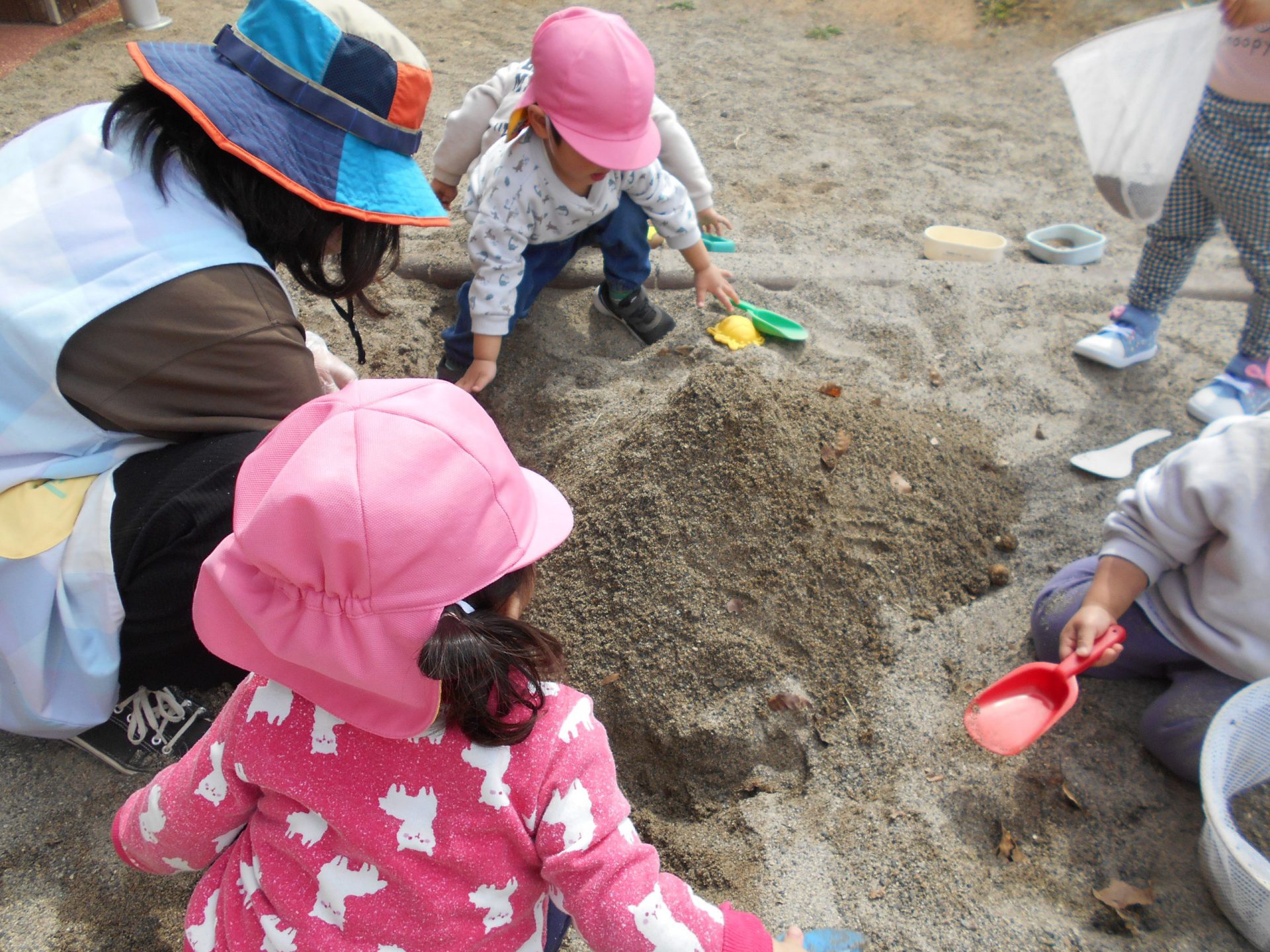 砂場で山づくりが始まりました。保育者の作り方を見て砂をかけてシャベルでトントン固めます。