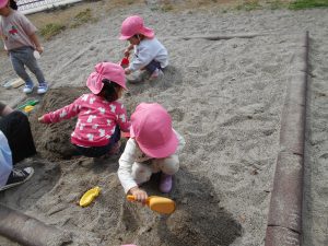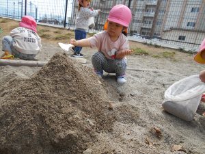 隣で見ていた女の子も真似をして砂山を作り始めました。