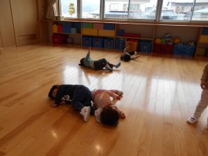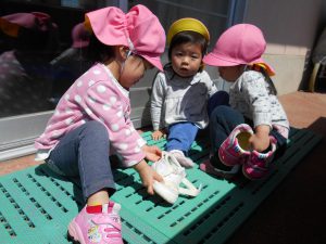 やってもらうのも、やってあげるのも嬉しそうでした。靴を履いた後は3人で手を繋ぎ戸外へ出かけて行きました。
