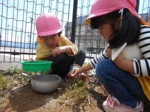 虫を一緒に観察したり、ごろごろと転がってみたり、友だちと同じことを経験し、思いを共有できるように言葉を掛けていきたいです。友だちとのやり取りの中で思いやる心や優しい言葉を知っていって欲しいですね。