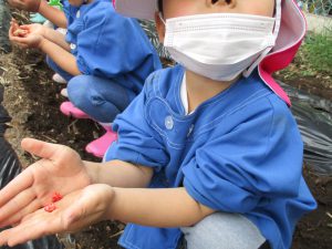 たねいも1つ1つに そーっと土をかけていきます