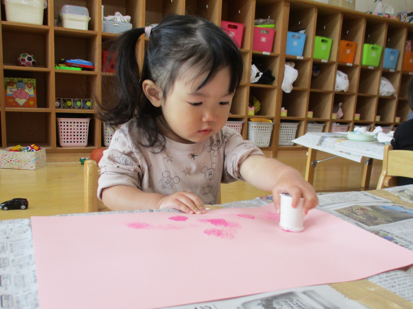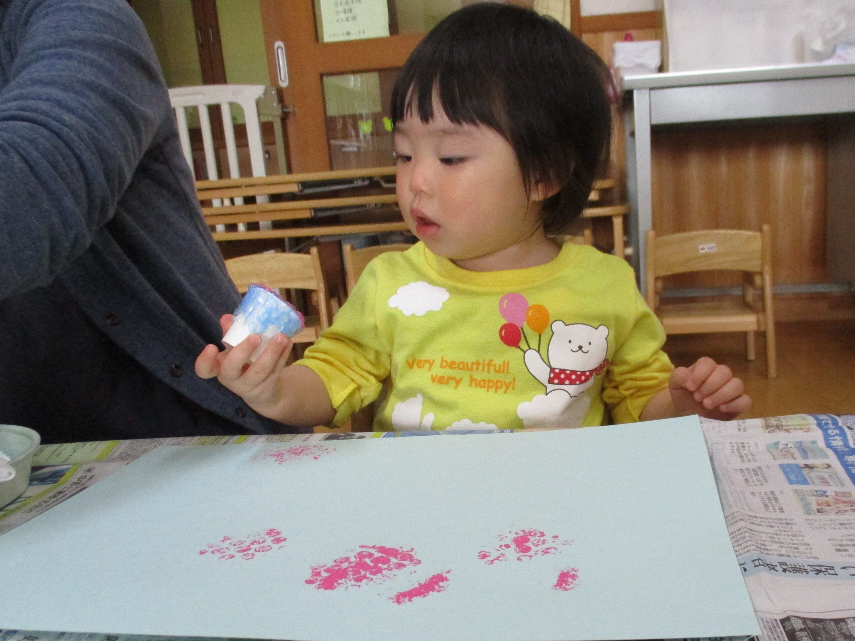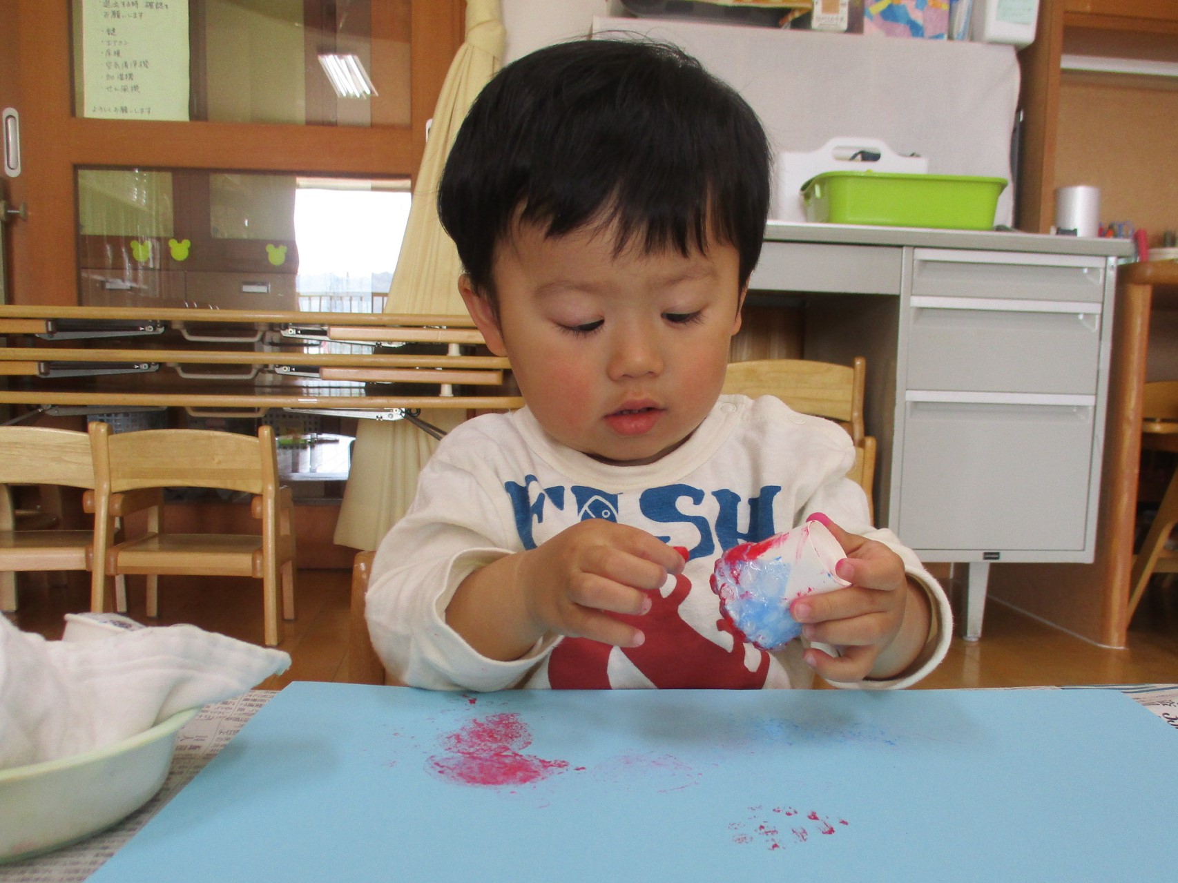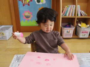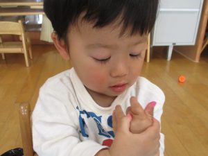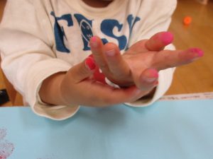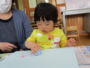 お部屋では、絵の具の感触を楽しみました。